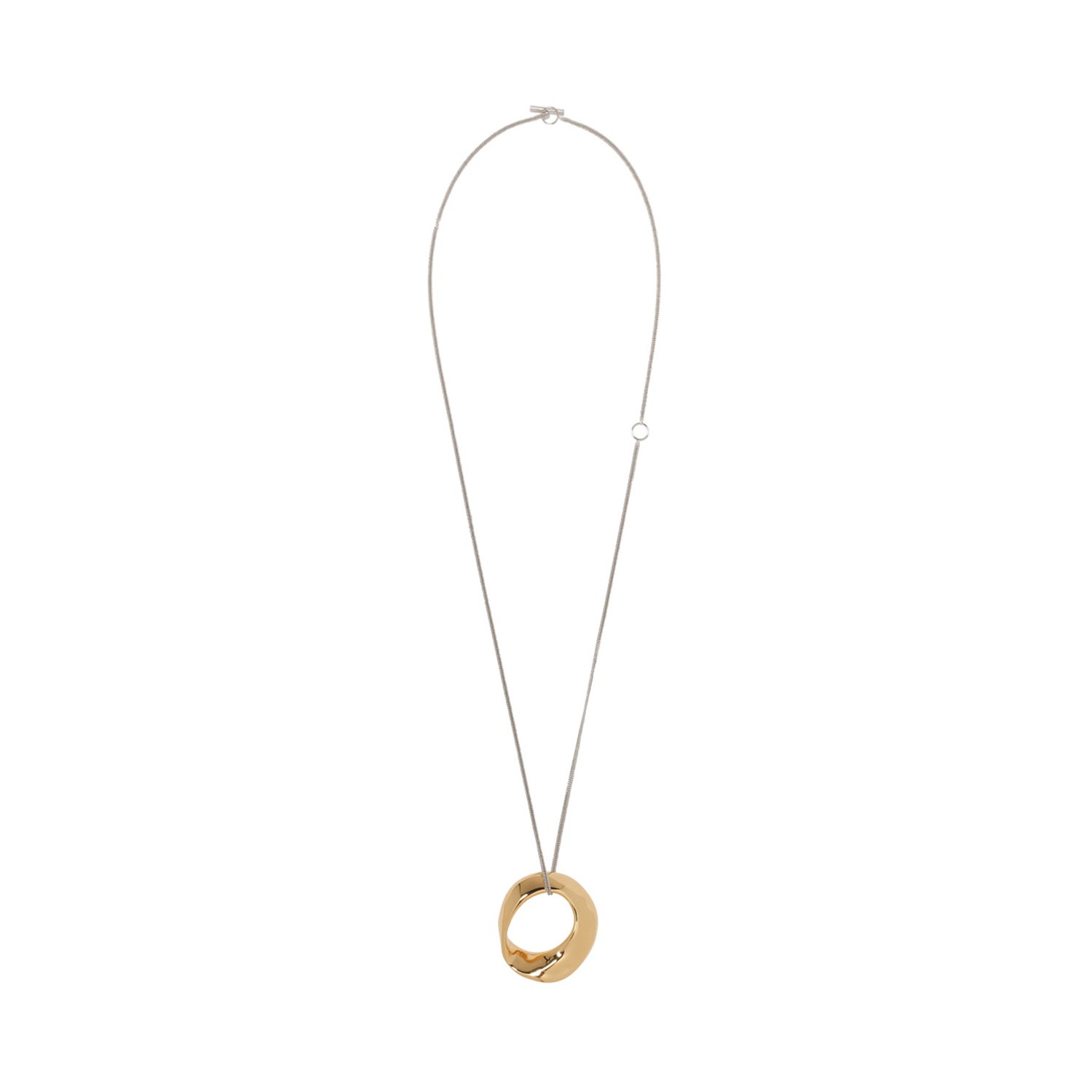 Jil Sander Ring Pendant Necklace. Gold and silver brass necklace, silver tone chain, gold tone ring shaped pendant. Adjustable length chain, toggle fastening.