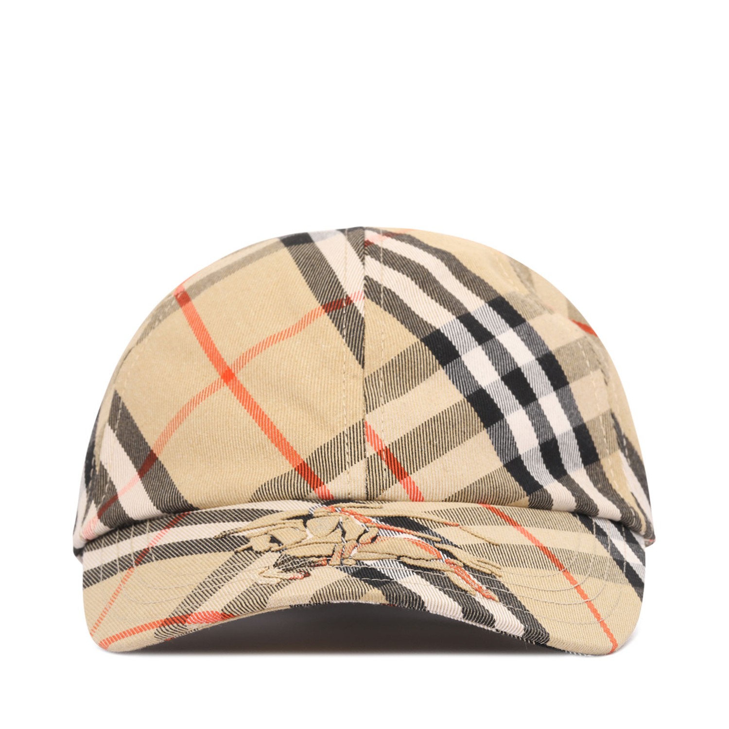 Burberry Vintage Check Baseball Cap. Archive beige and multicolour baseball cap, Vintage Check pattern, curved peak. Signature Equestrian Knight motif, curved wide brim, adjustable strap to the rear.
