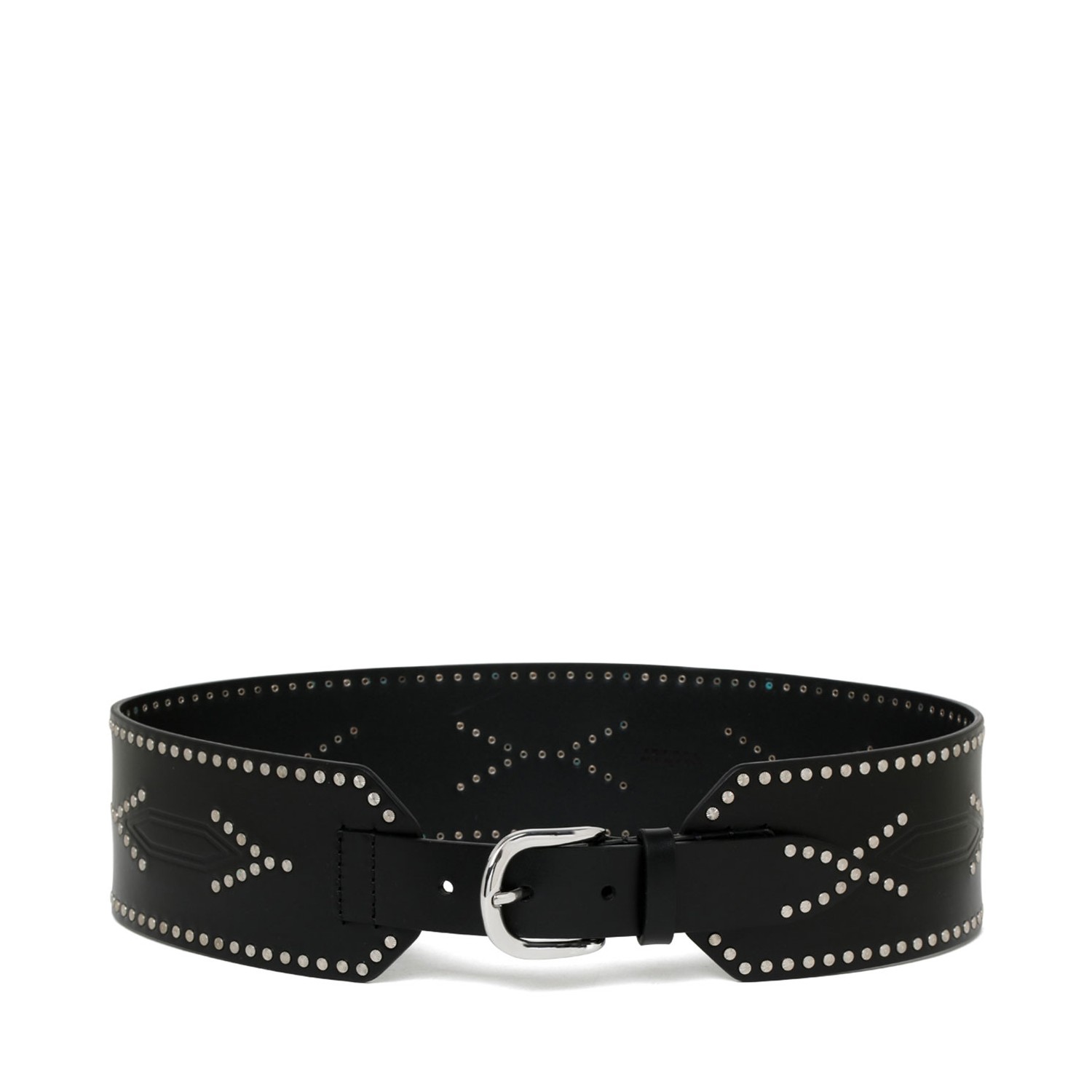 Isabel Marant Black Telma Belt. Black cowhide leather with silver tone hardware buckle closure, studded detail.
