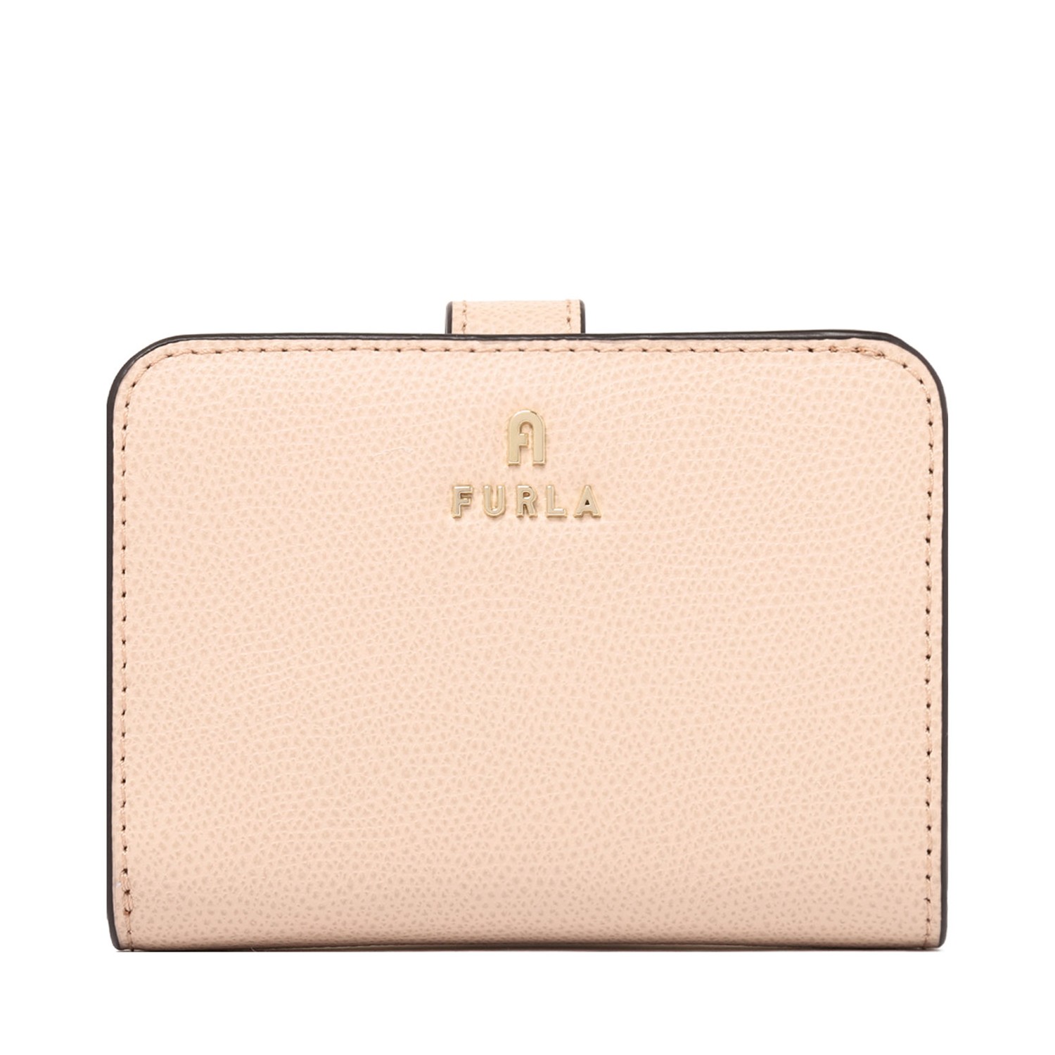 Furla Ballerina Camelia Compact Wallet. Ballerina wallet, six internal credit card slots, four internal side pockets. Internal compartment for banknotes, internal coin pocket with zip closure. Snap button closure, Furla logo and Arco punched on the front.