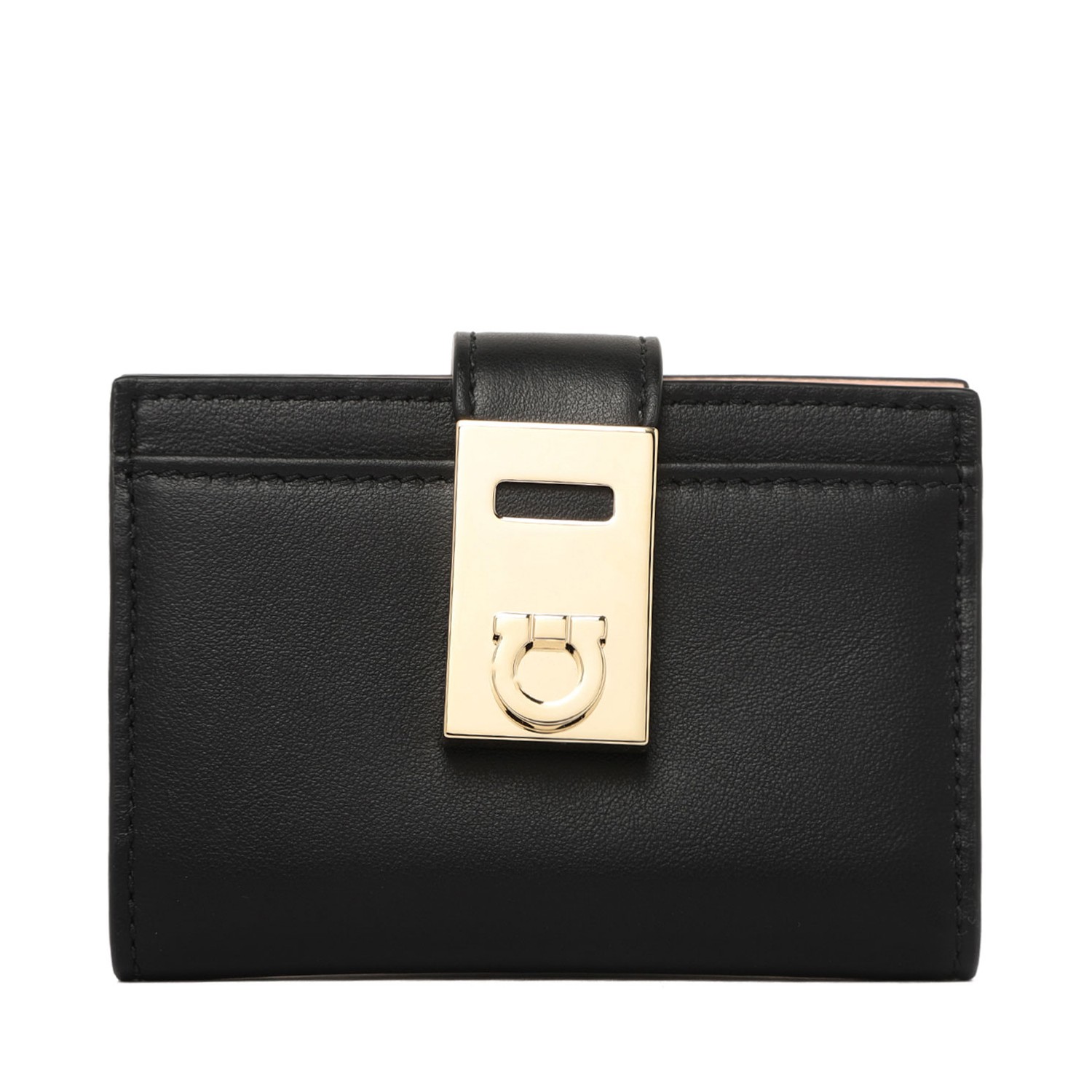 Ferragamo Black Hug Wallet. Black leather wallet, tonal stitching, Gancini plaque, gold-tone hardware, colour-block design. Magnetic strap fastening, internal logo stamp, internal card slots, contrast lining.