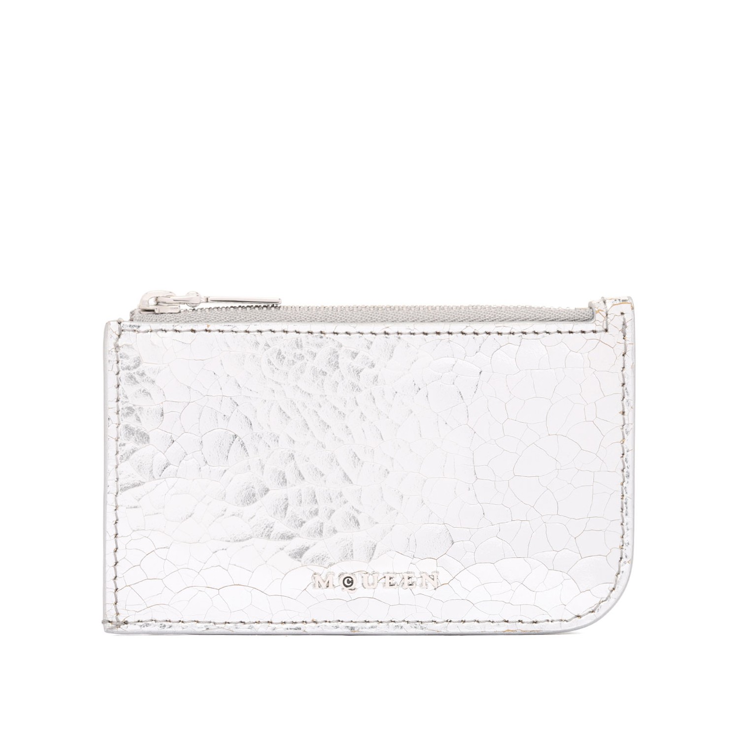 Alexander McQueen Silver Sling Zip Around Pouch. Silver sling zip around pouch, asymmetrical model crafted from beige suede calfskin. Metallic silver crackle coating. Features a central zip compartment and a card slot inside.