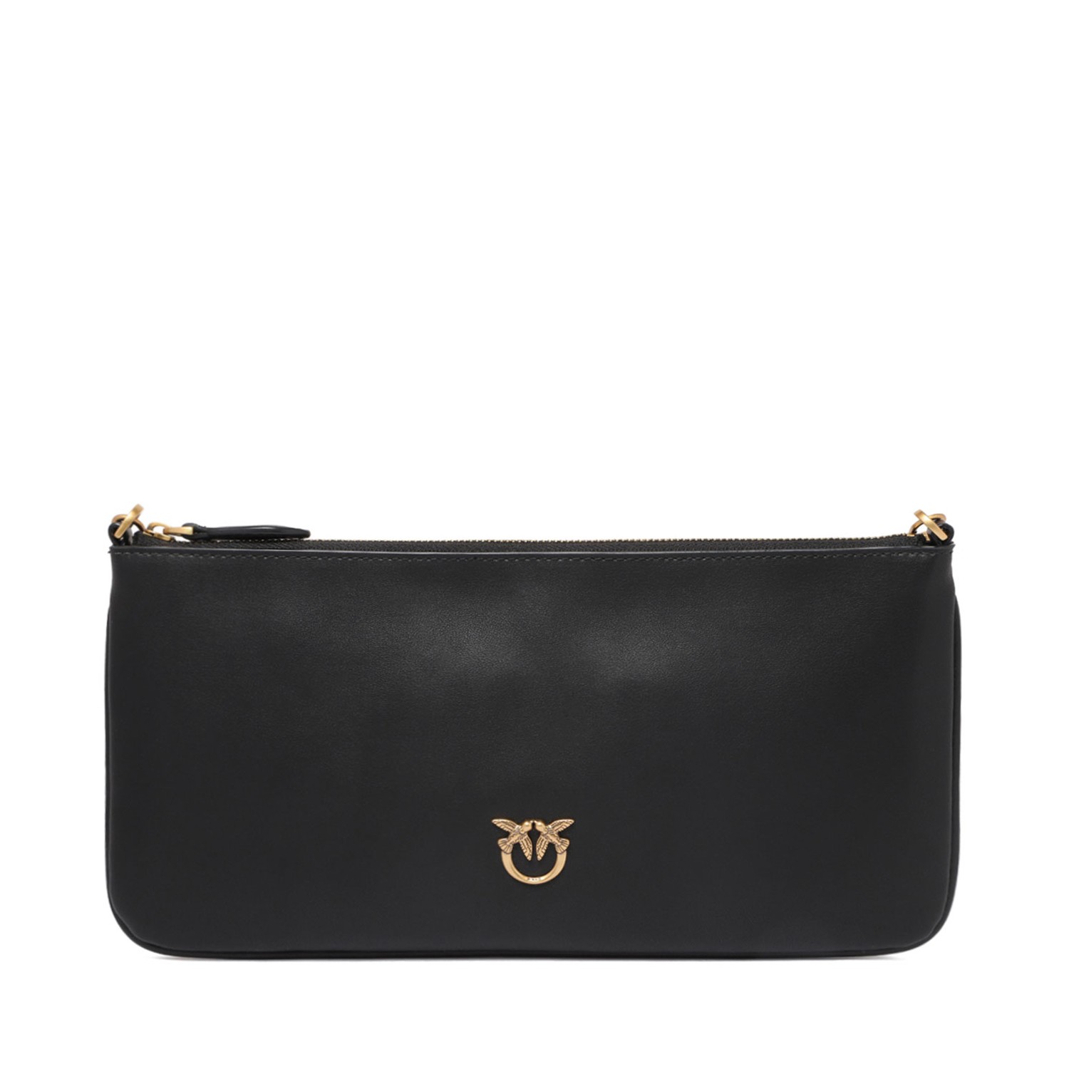 Pinko Black Love Birds Wallet. Black leather wallet with signature Love Birds buckle, chain-link shoulder strap. Top zip fastening, main compartment, debossed internal logo. Internal card slots, gold-tone hardware.