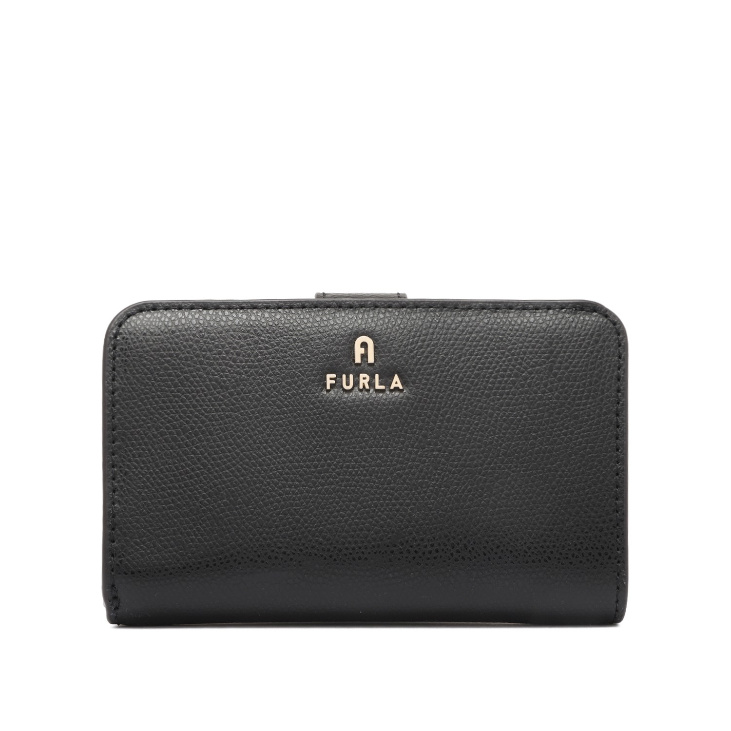 Furla Black Camelia Compact Wallet M. Black leather wallet with ten internal credit card slots, internal banknote compartment, four internal side pockets. Internal coin pocket with zip closure, flap closure with press stud. Mini Furla and Arco logo punched on the front.