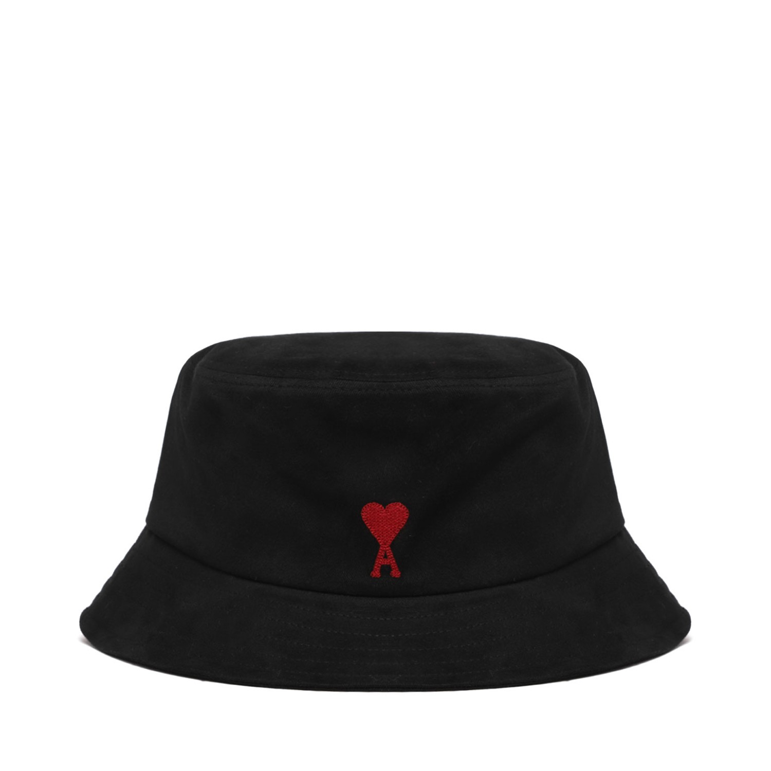 Ami Paris Black and Red Logo Embroidery Bucket Hat. Black cotton hat with red signature Ami de Coeur monogram motif embroidery to the front, gabardine weave. Flat crown, dropped wide brim.