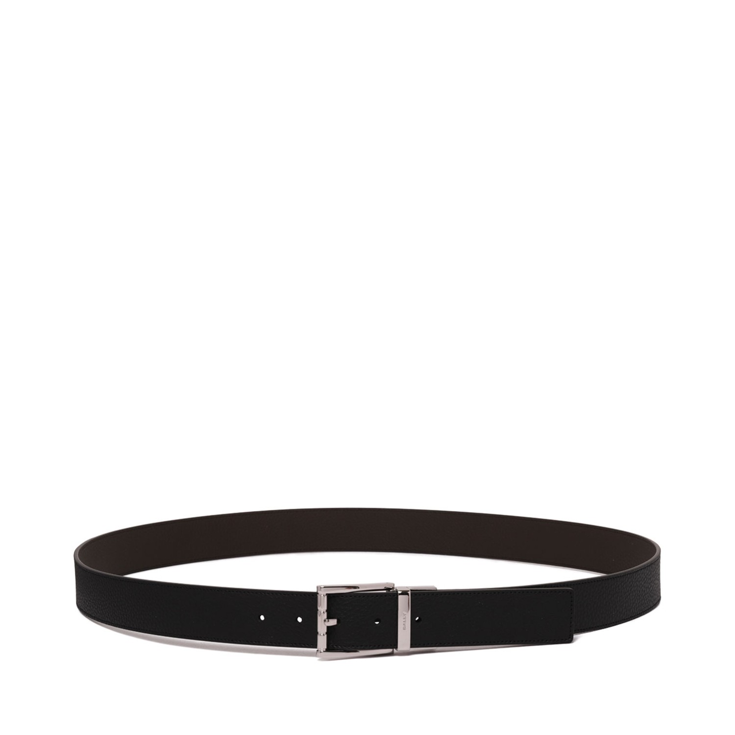 Bally Black Logo Engraved Leather Belt. Black calf leather belt with grained texture, engraved logo, buckle fastening. Punched holes and adjustable fit.