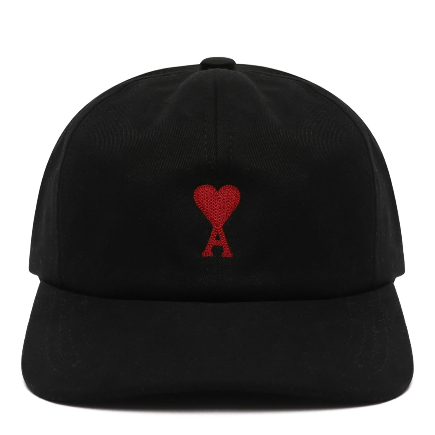 Ami Black Ami De Coeur Hat. Black cotton hat with twill weave, signature Ami de Coeur monogram embroidery to the front, logo-engraved silver-tone hardware. Eyelet vents, fabric-covered button at the crown, six-panel construction. Round crown, curved peak, rear slide-buckle fastening.