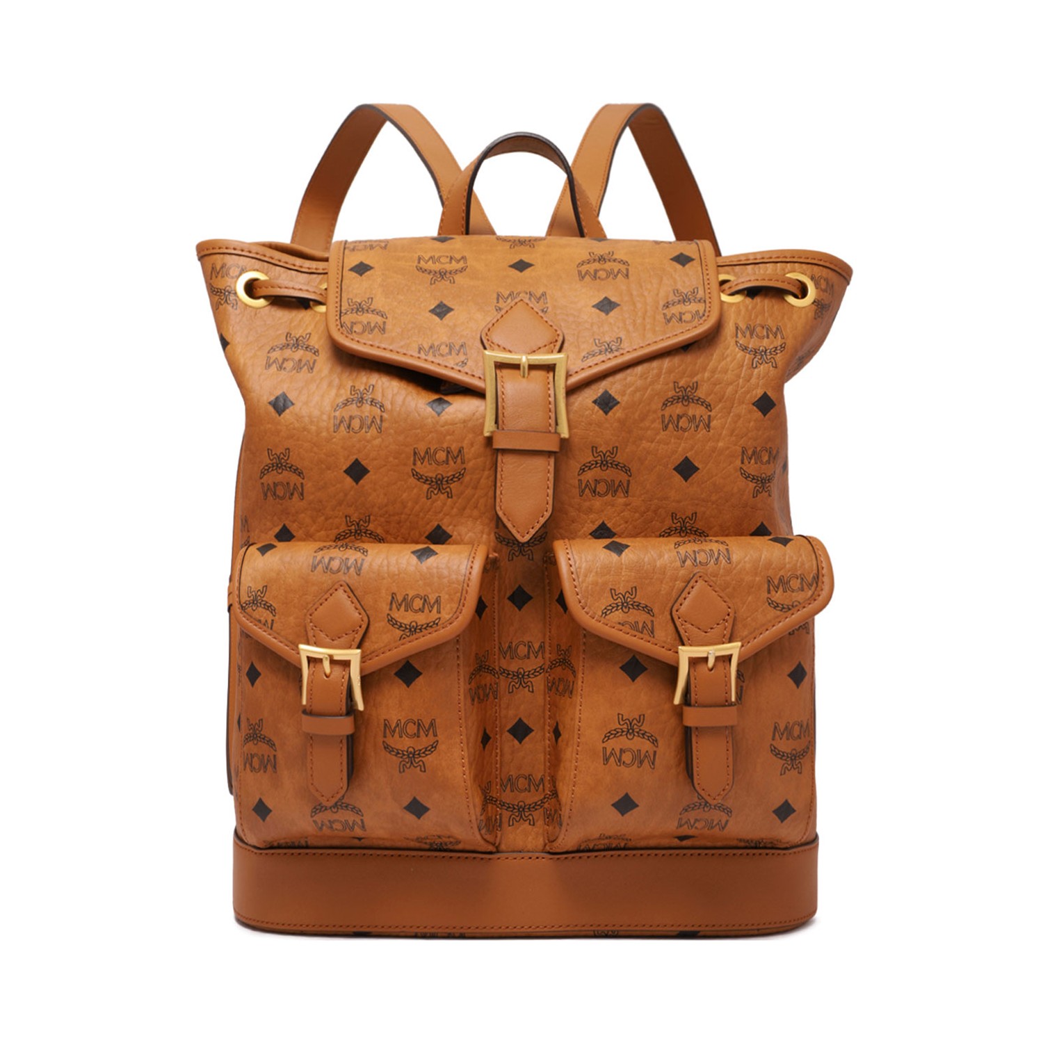 MCM Cognac Small Aren Monogram Print Backpack. Cognac leather backpack with front flap pockets, gold-tone buckle detail, adjustable shoulder straps and top handle.