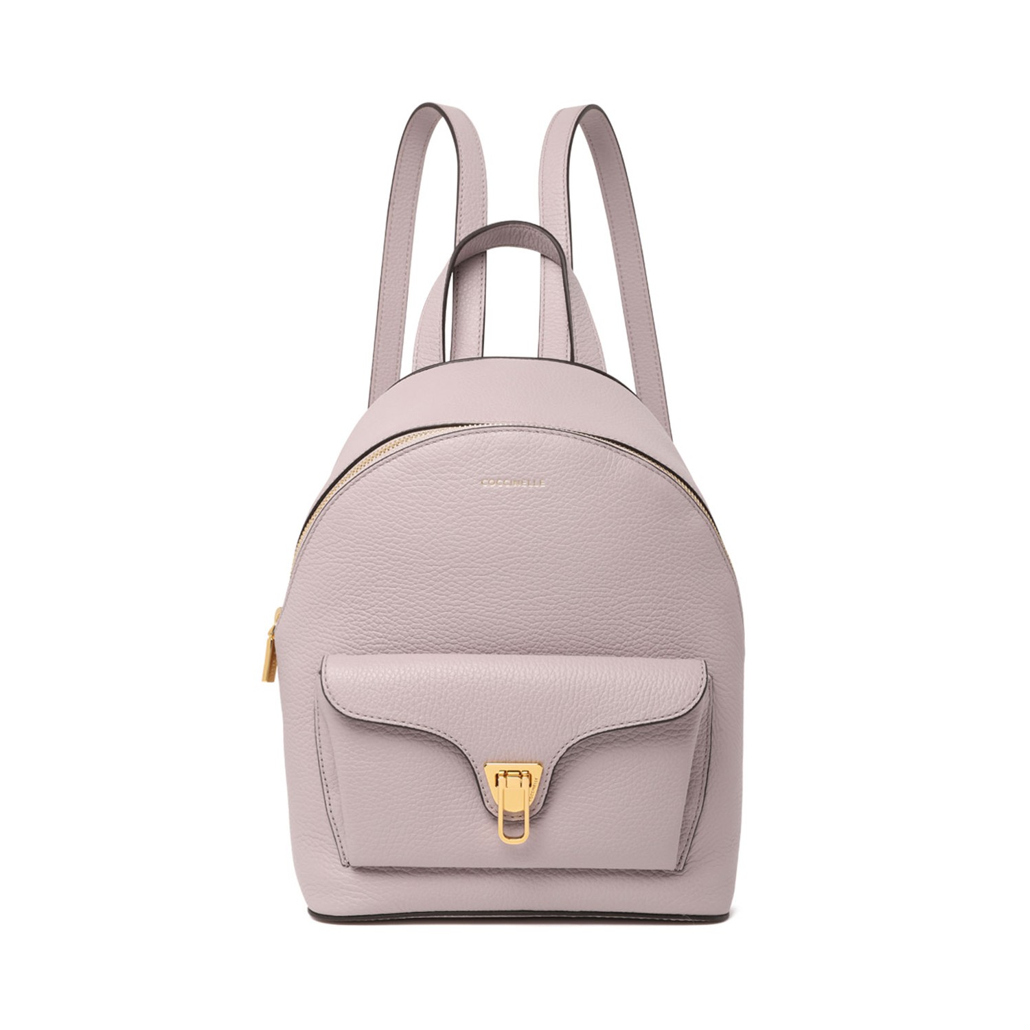 Coccinelle Oyster Beat Generation Small Backpack. Oyster grained leather small backpack with zip closure, leather handle for hand portability. Adjustable leather shoulder straps with buckle, external front pocket with iconic closure, three internal pockets, one of which is closed with a zip. Gold plating and gold stamp logo.