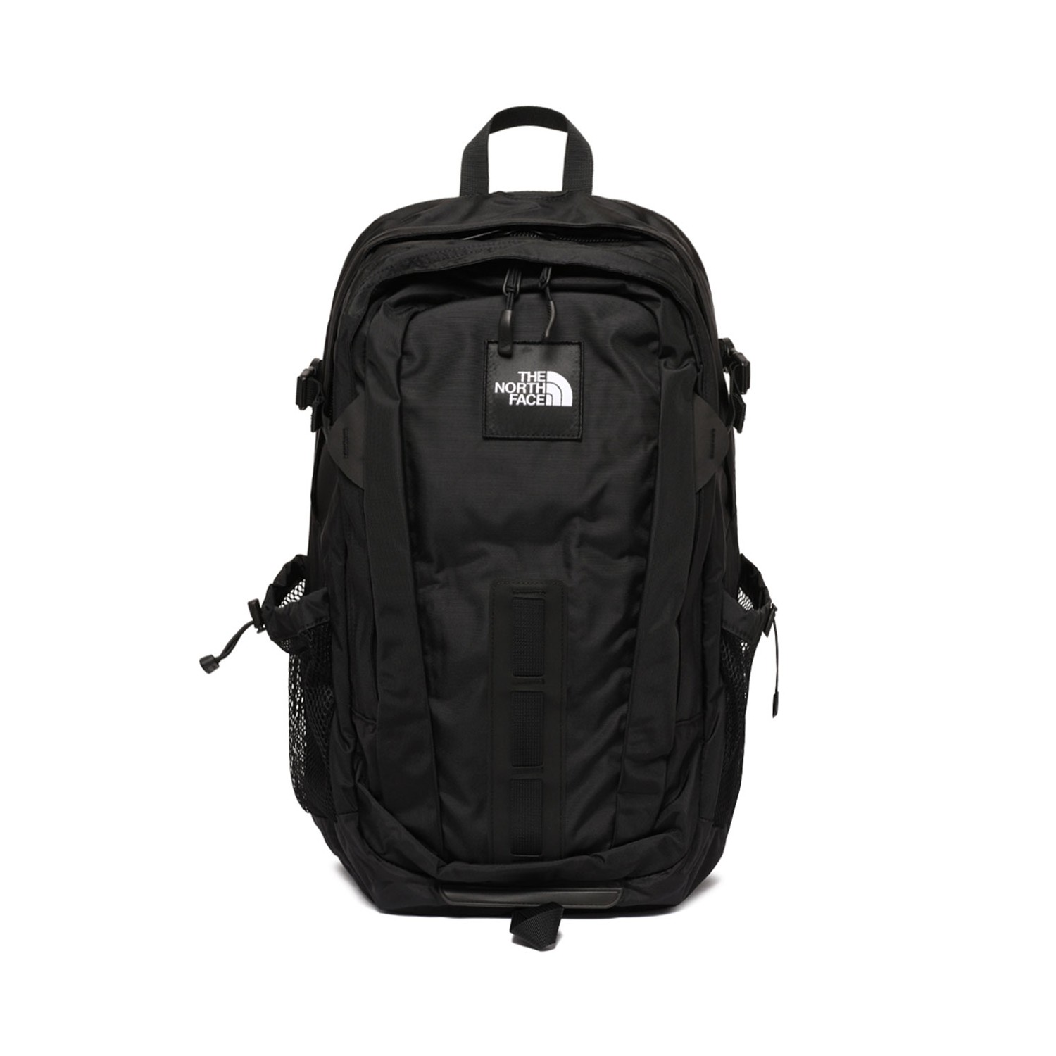 The North Face Black Hot Shot Backpack. Black hot shot backpack with two-way zip fastening, single flat top handle, two padded adjustable shoulder straps. Applique logo, strap detailing, two side patch pockets.Adjustable side straps, partitioned compartment amd internal zip-fastening pocket.