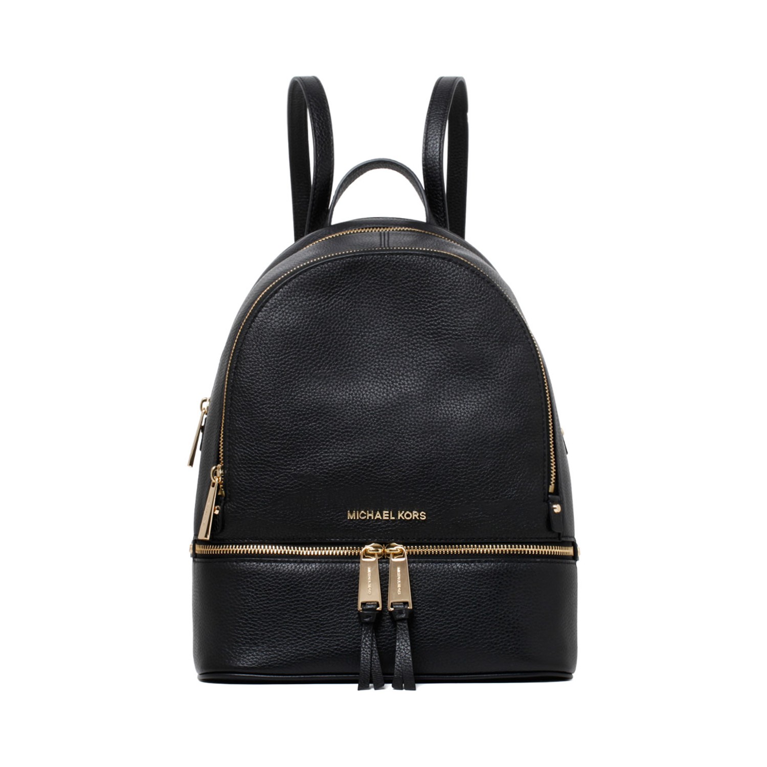 Michael Kors Black Rhea Backpack. Black leather backpack, adjustable shoulder straps, zip closure.Internal zip pocket, one external zip compartment for tablet holder, one low compartment with double zip. Gold-coloured hardware, handle Case with logo.