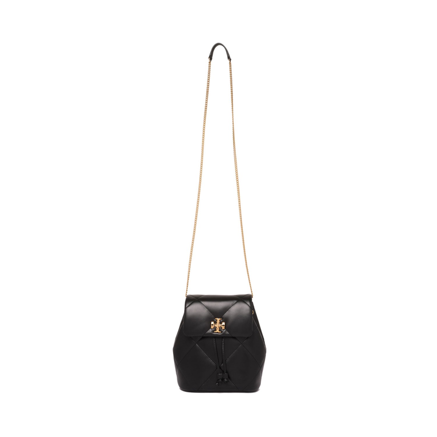 Tory Burch Black Mini Kira Diamond Quilt Backpack. Black mini Kira diamond quilt Backpack is irresistibly soft with blown-up diamond stitching and pillowy dimension. The quilted bag is detailed with beveled metal Double T hardware. The chain straps convert to a crossbody so you can carry it two ways. Crafted in partnership with a Leather Working Group-certified tannery, supporting high standards in leather manufacturing and chemical management.
