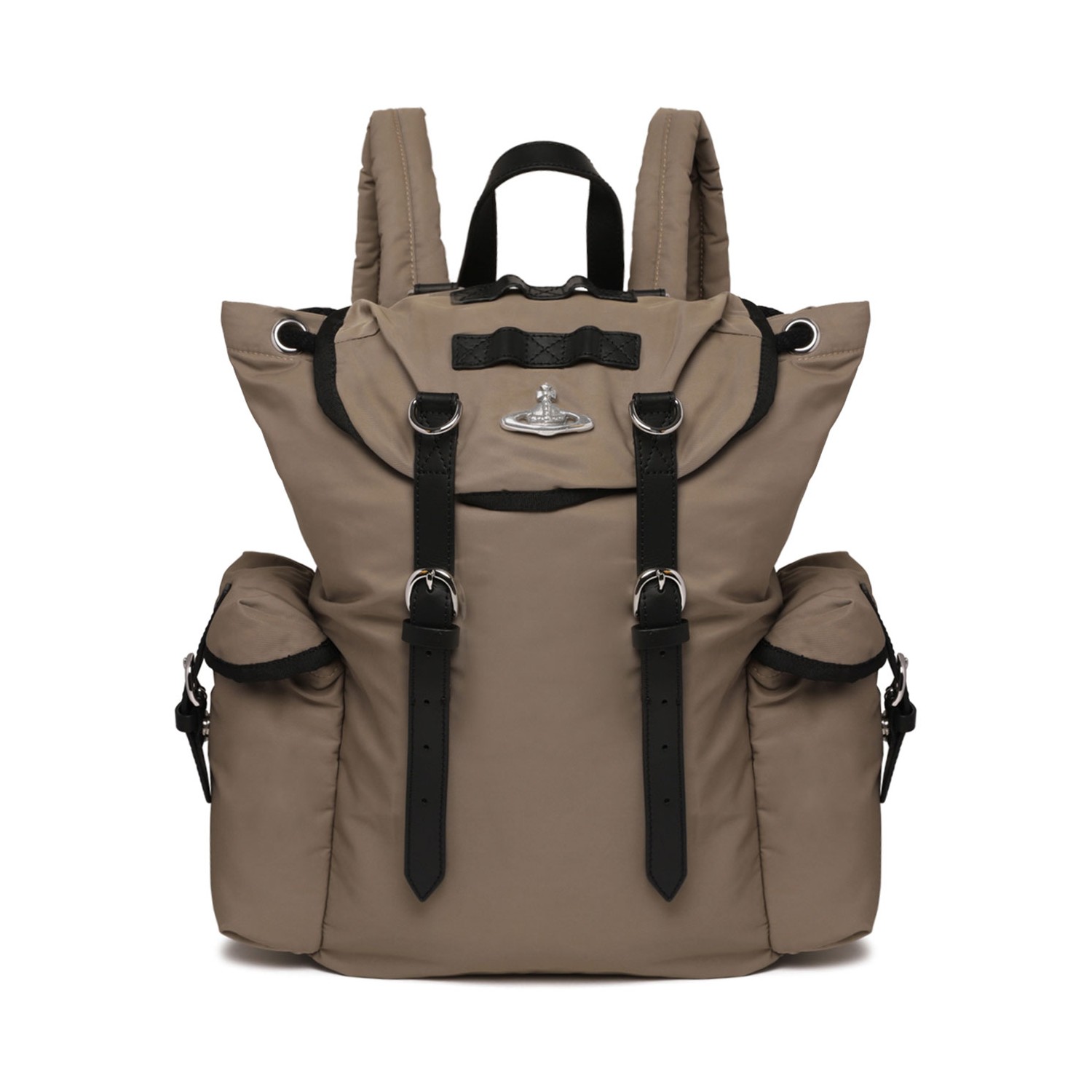 Vivienne Westwood Taupe Nylon Backpack With Orb Logo. Taupe backpack with a functional yet distinctive silhouette. Backpack crafted in lightweight padded nylon with durable leather straps and trims. Featuring a top flap with drawstring closure, adjustable shoulder straps, front and side pockets, top handle and the iconic silver-tone Orb logo on the front, combining practicality with Vivienne Westwood