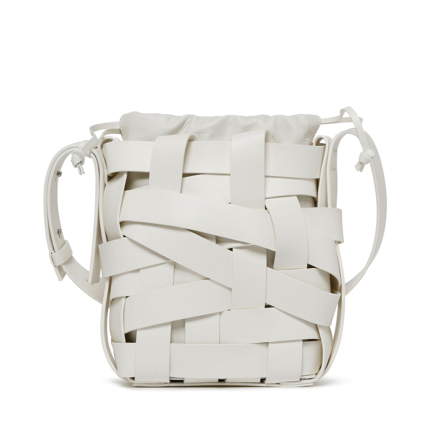 Jil Sander Small White Bucket bag. Ivory white calf leather bucket bag, interwoven design, adjustable shoulder strap. Main compartment, drawstring fastening.