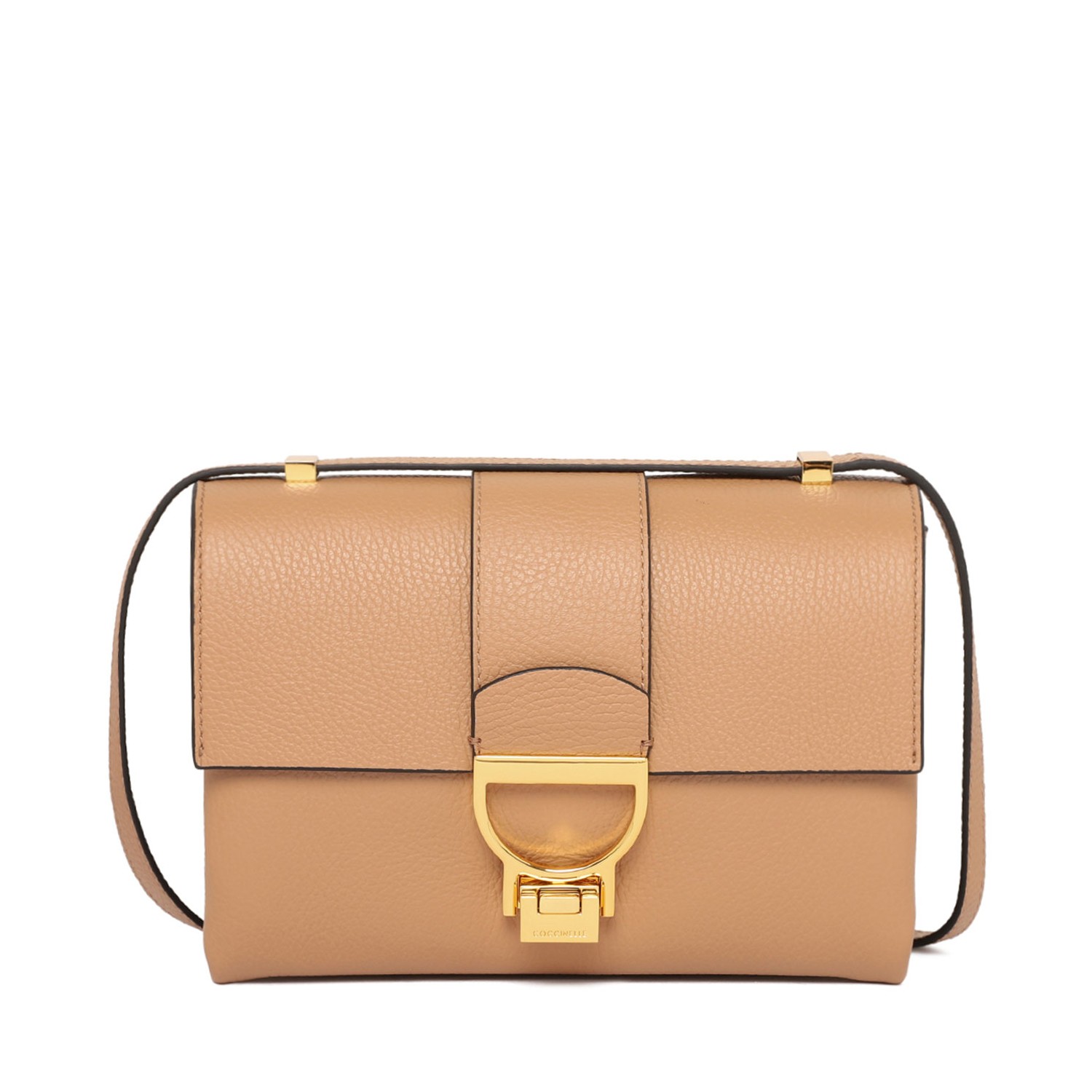 Coccinelle Skin Arlettis Crossbody Bag. Skin crossbody bag made of leather with metal clasp and sliding shoulder strap. Flap closure, three internal compartments, faux leather interior. Can be worn either over the shoulder or on the shoulder.
