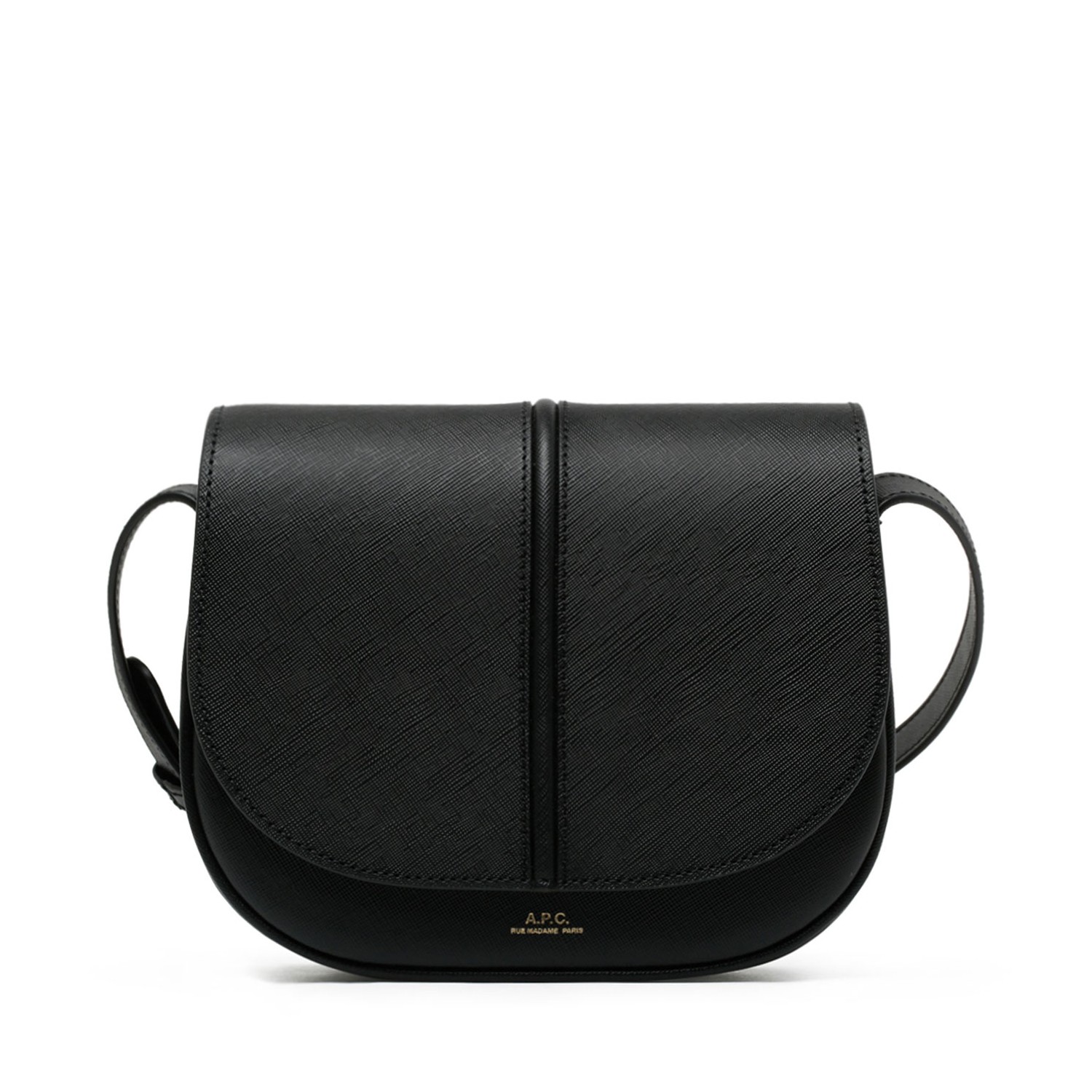 A.P.C. Black Betty Bag. Black leather shoulder bag, signature trim on the front, magnetic flap closure, interior pocket. Shoulder strap adjusts with a metal buckle, reinforced base, embossed goldtone logo.