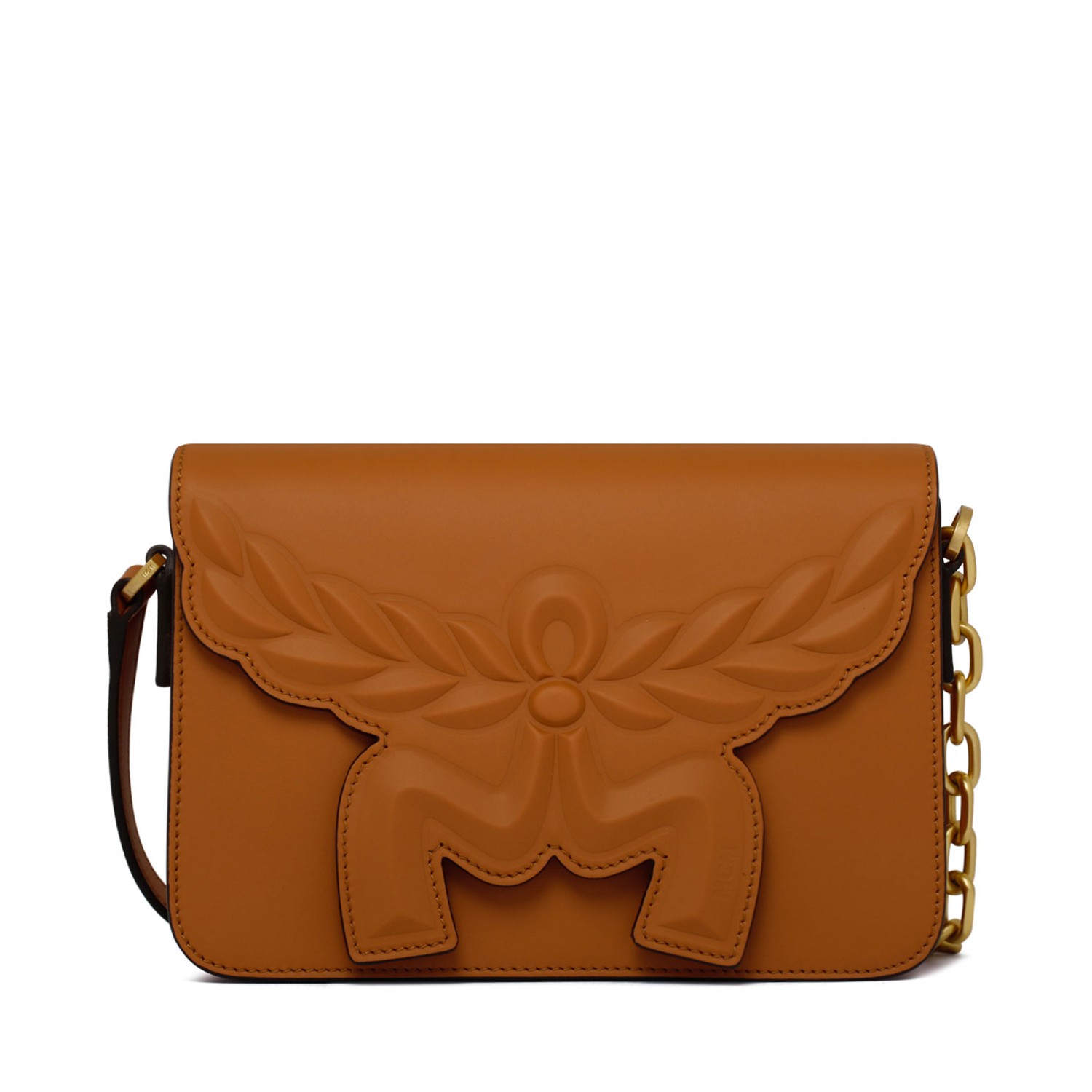 MCM Brown Himmel Crossbody Bag. Brown calf leather crossbody bag, foldover top with magnetic fastening, embossed logo to the front. Adjustable leather and chain link shoulder strap, partitioned compartment, internal card slot, suede lining.