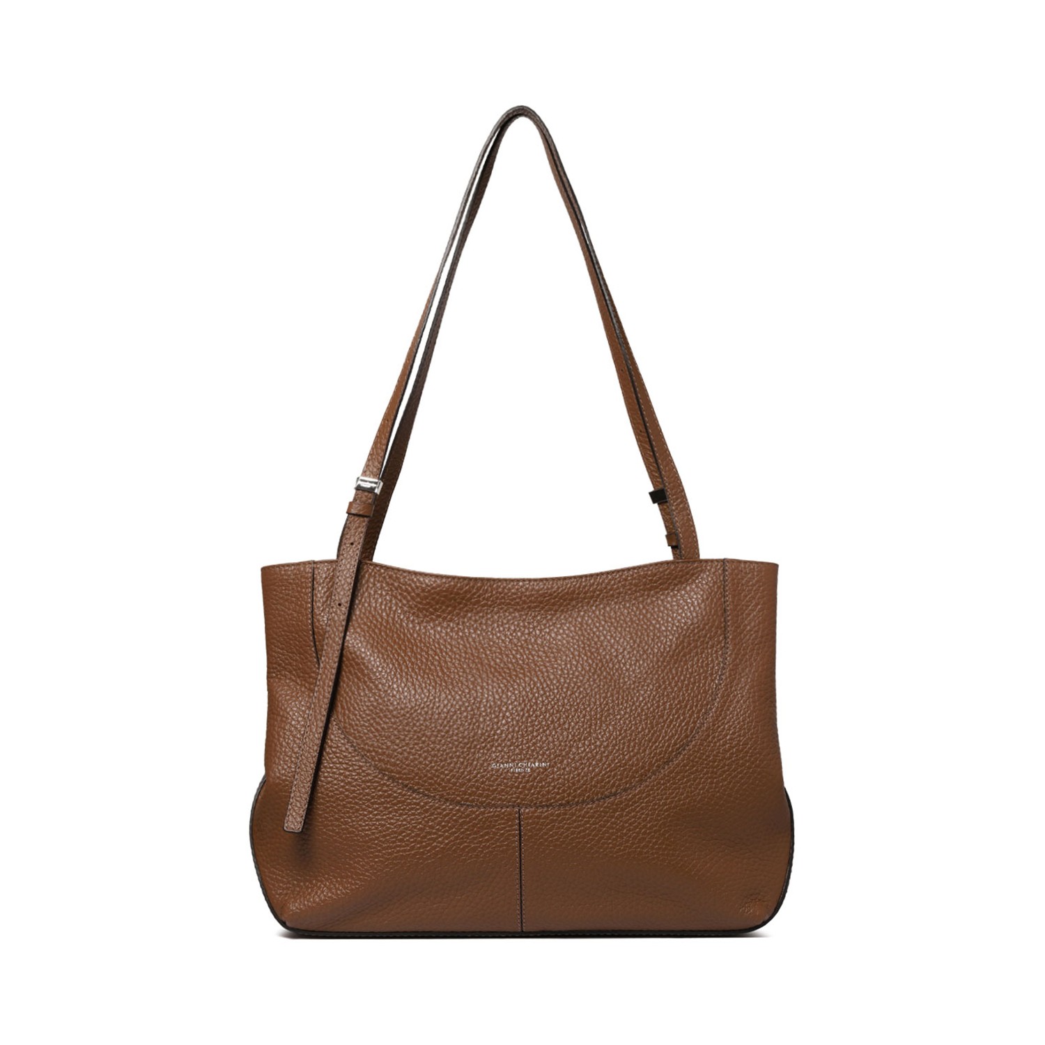 Gianni Chiarini Brown Minerva Bag. Brown maxi grain leather bag, top flap with magnetic closure and an adjustable and removable shoulder strap in woven fabric.