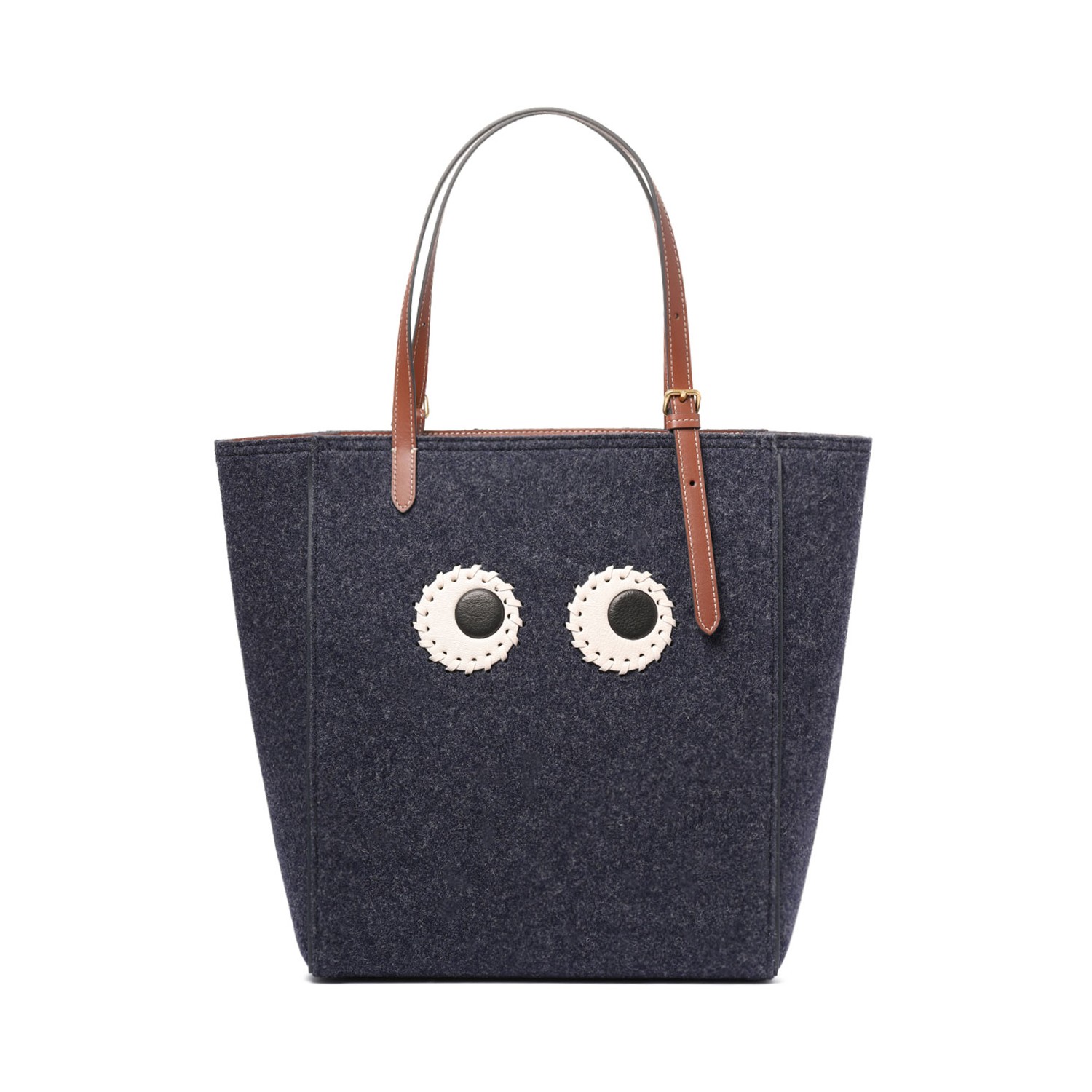 Anya Hindmarch Navy Blue Small Tote Bag. Navy blue wool felt and smooth leather tote bag, leather expandable shoulder strap, Anya Eyes motif, leather tab with Anya Hindmarch logo and bow. Internal leather tab with Anya Hindmarch logo and gold bow.