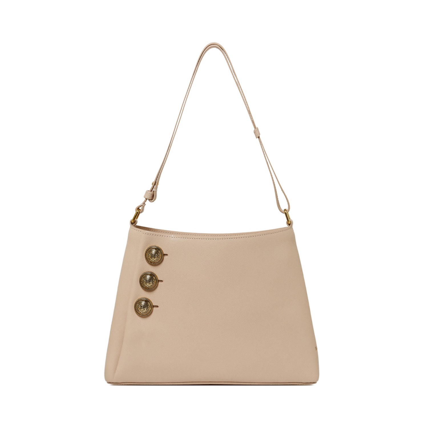 Balmain Beige Shoulder Bag. Beige grained leather shoulder bag, adjustable handle, to be worn on the shoulder. Flap effect on the side, three decorative Balmain "Coin" buttons detail, press stud on leather flap. Internal zip pocket and gold metal details.