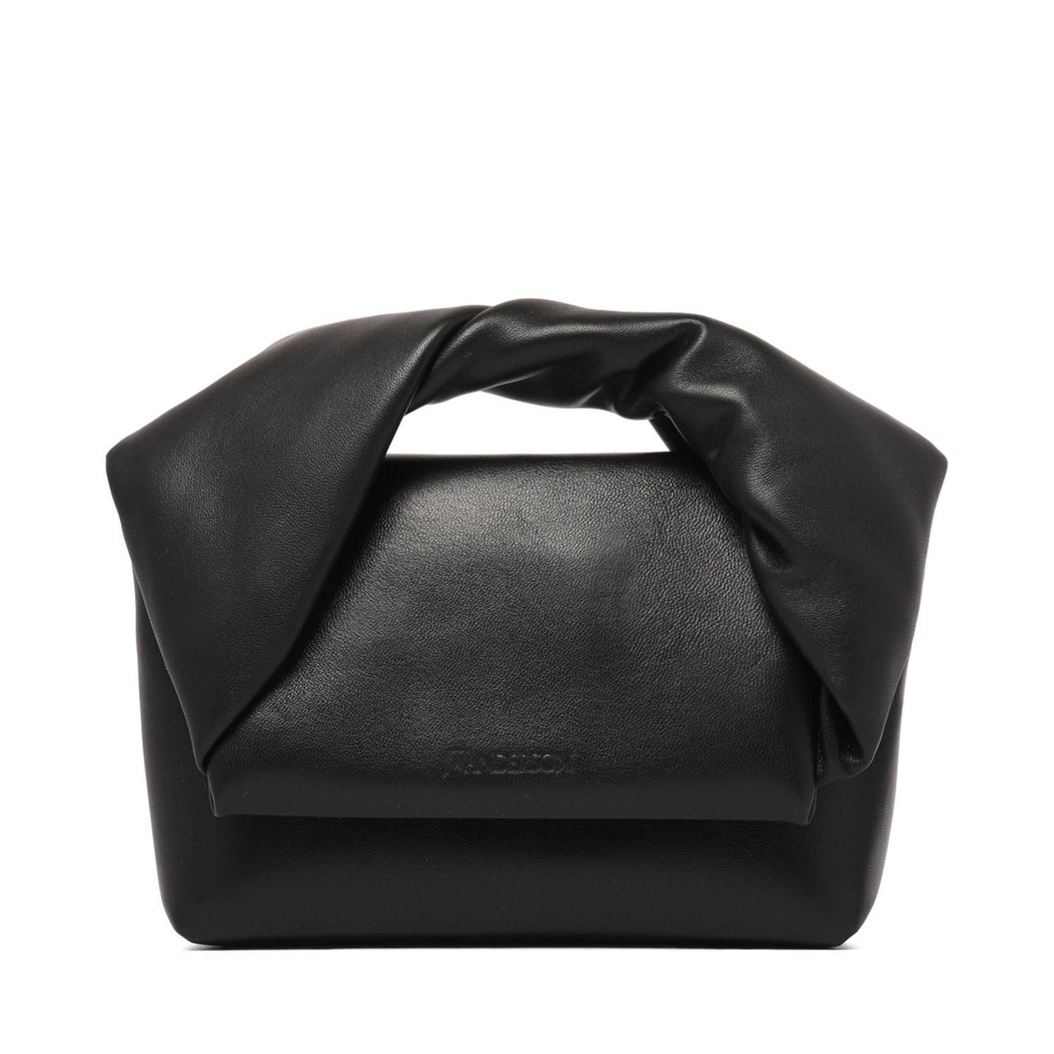 JW Anderson Black Small Twister Bag. Black lambskin bag, debossed logo to the front, gold-tone hardware, foldover top with magnetic fastening. Detachable chain-link shoulder strap, single twisted top handle, main compartment. internal slip pocket. Internal logo stamp, contrasting leather lining.