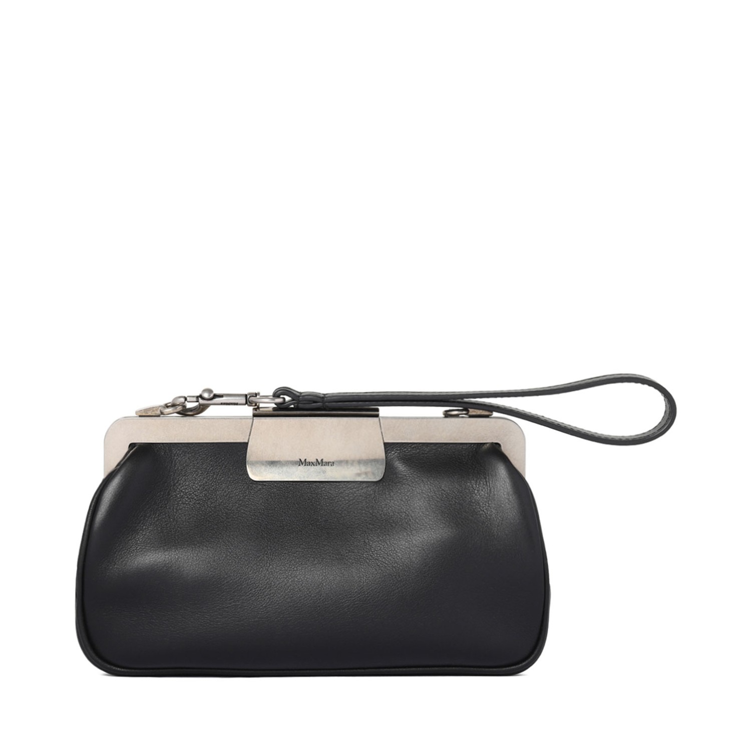 MaxMara Black Clasp Bag. Black soft natural calfskin small bag, rigid zip closure treated with a vintage effect finish and maxi front plaque with Max Mara logo. Interior with tone-on-tone leather card holder pockets, removable and adjustable shoulder strap with logoed metal plate buckle.