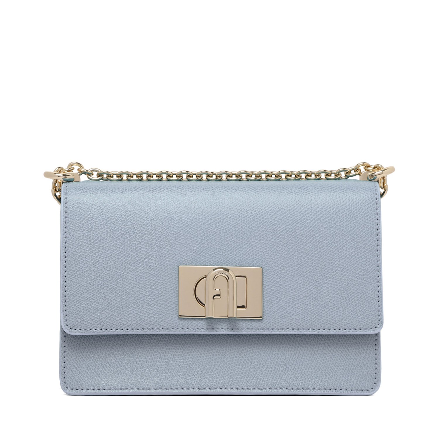 Furla Light Blue 1927 Shoulder Bag. Light blue leather shoulder bag, turn-clasp fastening, chain-link shoulder strap, main compartment.