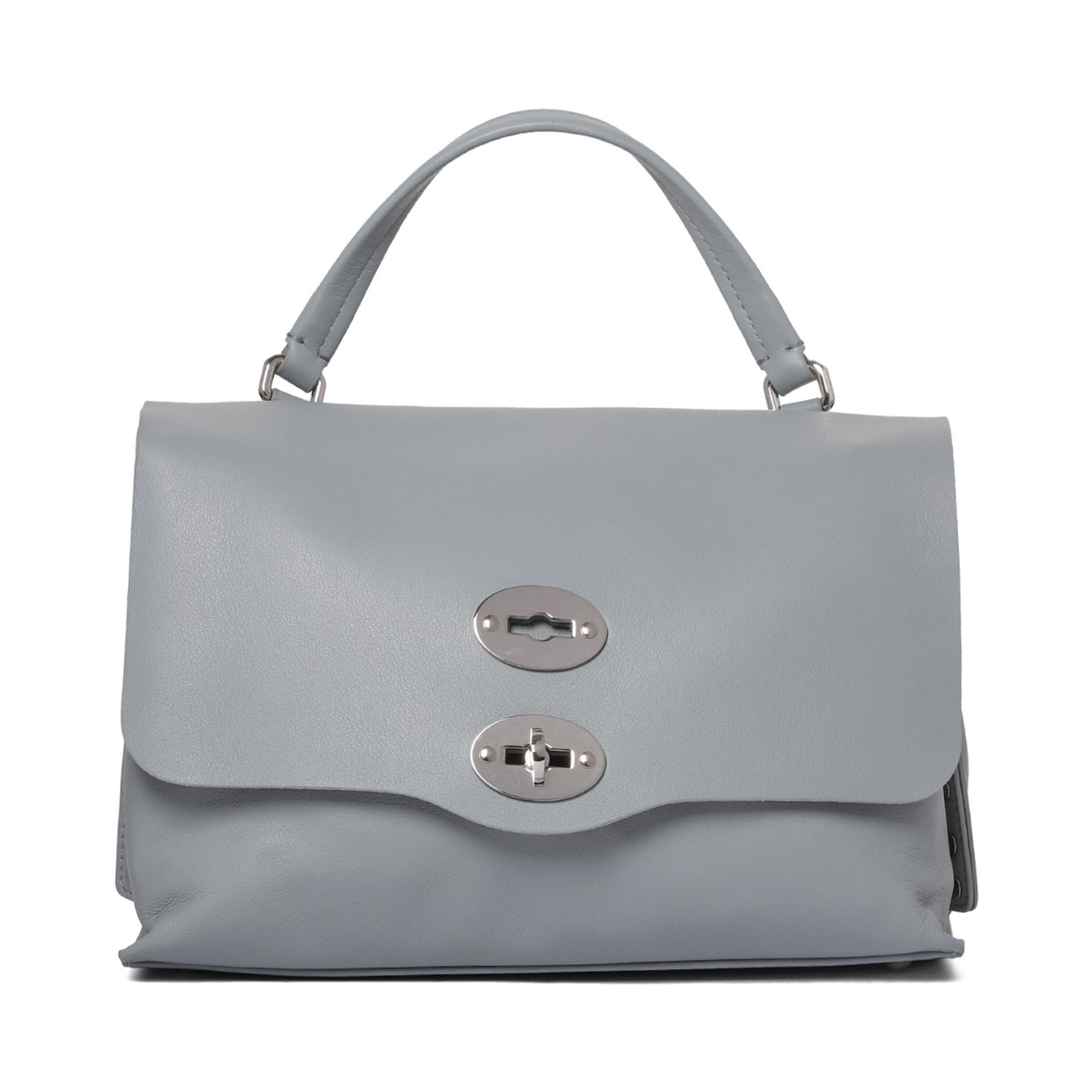Zanellato Light Blue Postina Bag. Light blue leather bag with silver trim and studs, top handle, twist-lock top closure, inside zip pocket, adjustable and detachable shoulder strap.