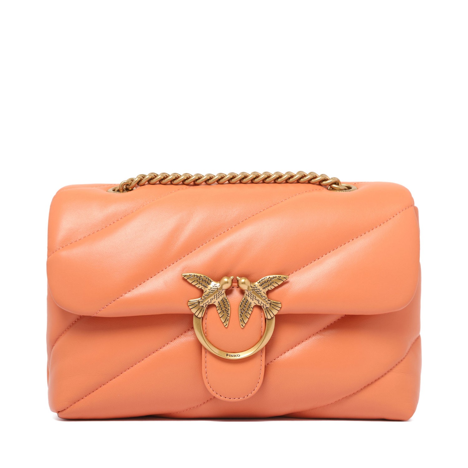 Pinko Classic Love Puff Butterfly Bag. Light orange quilted shoulder bag, signature Love Birds buckle foldover top with magnetic fastening, leather and chain-link shoulder strap.