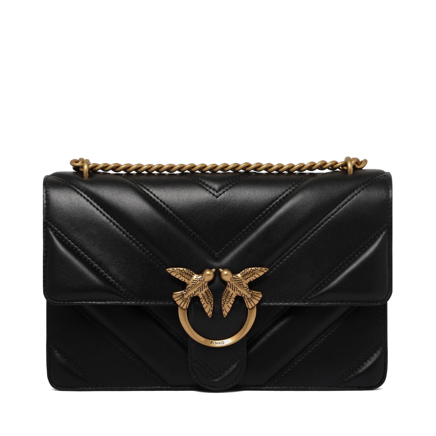 Pinko Black Love One Shoulder Bag. Black leather shoulder bag, clasp fastening, chevron quilting. Adjustable leather and chain-link shoulder strap, internal zip-fastening pocket.