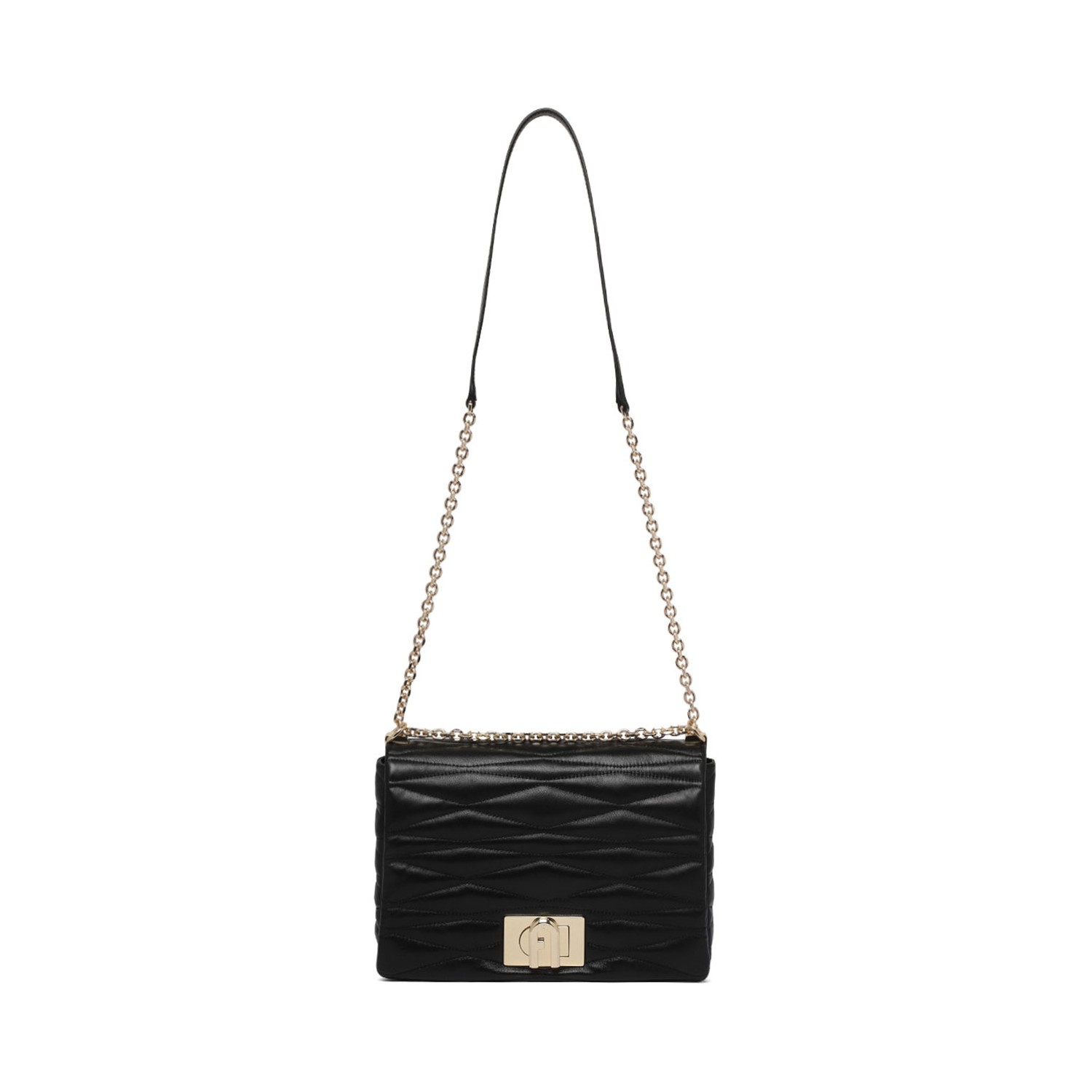 Furla Black Medium Shoulder Bag. Black quilted shoulder bag with chain-link shoulder strap, foldover top, internal zip-fastening pocket, gold-tone logo plaque.