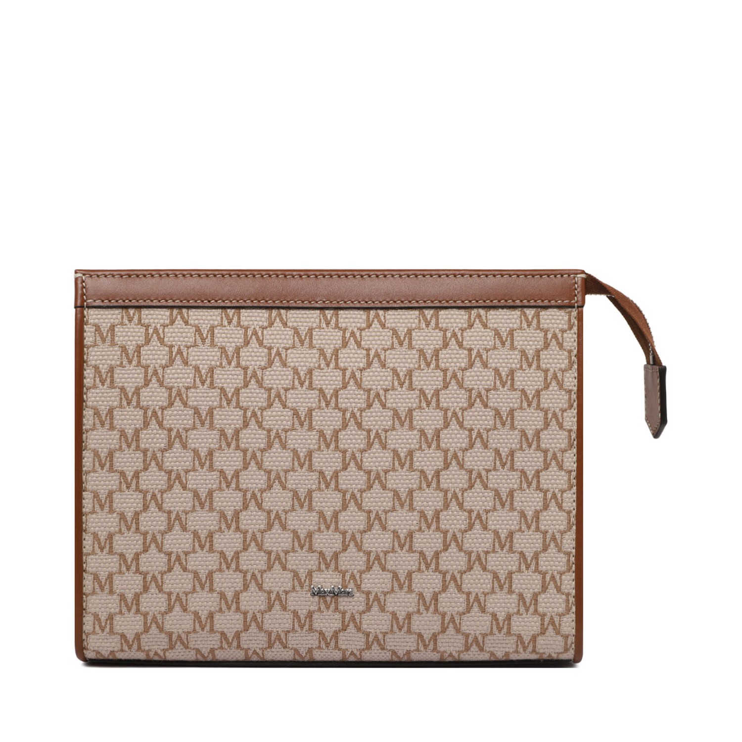Max Mara Small Flat Envelope. Flat envelope, small version, made of cotton fabric with monogram jacquard motif designed all over. Finished with leather details, Max Mara logo applied on the front. Contrasting nappa interior with flat leather pocket. The removable shoulder strap allows you to wear it on the shoulder or by hand. Zip closure at the top.