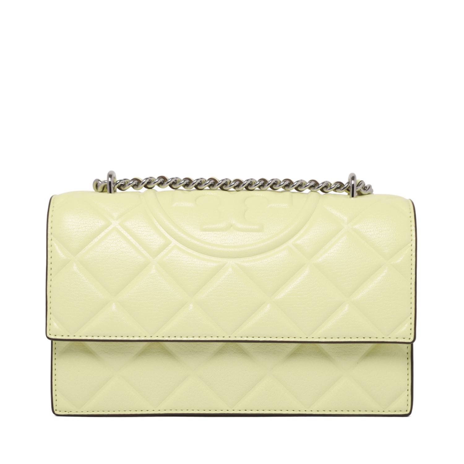Tory Burch Small Fleming Shoulder Bag. Frozen zest leather shoulder bag, quilted, foldover top with magnetic fastening. Chain-link shoulder strap, embossed logo to the front, main compartment, internal zip-fastening pocket.