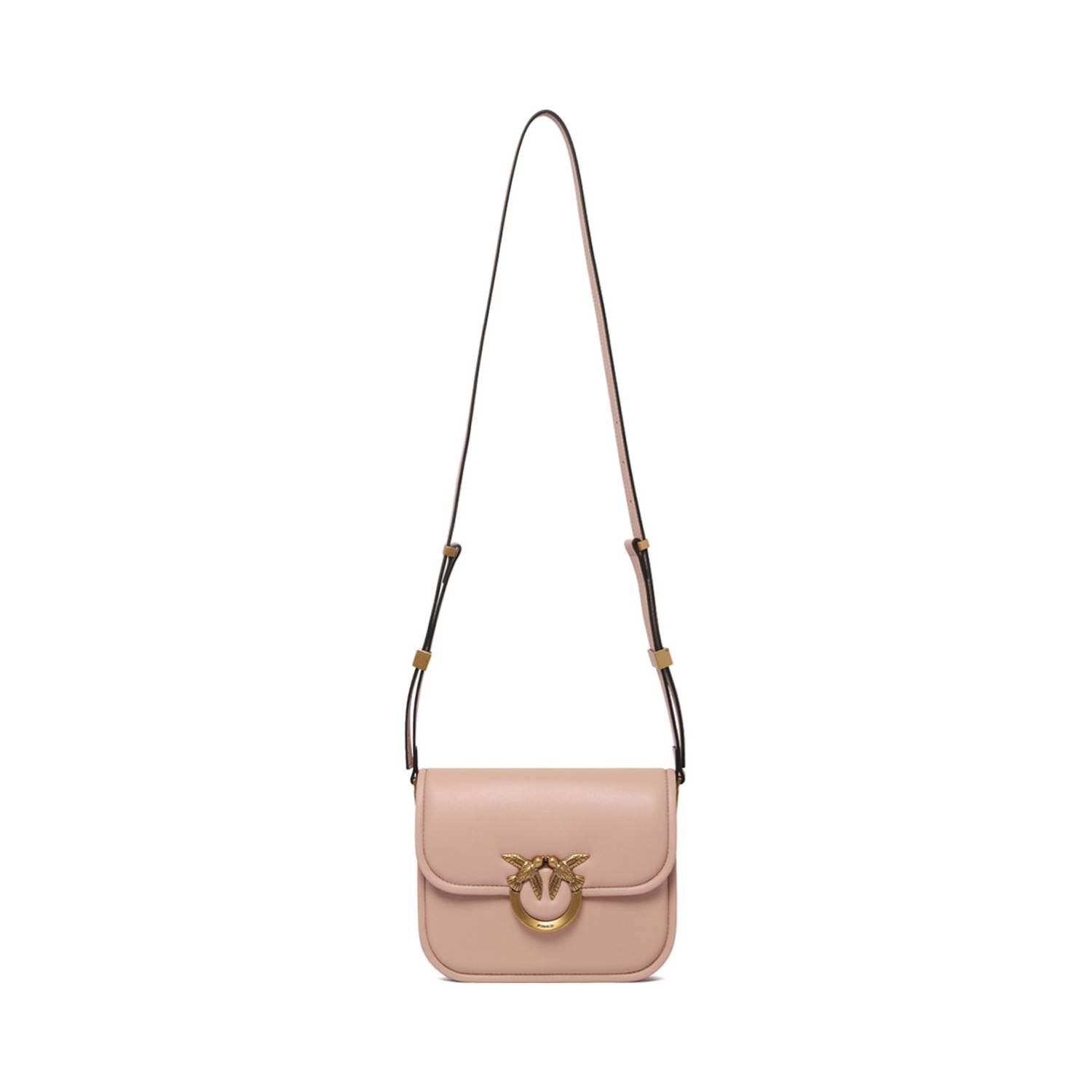 Pinko Pink Love Bag. Pink bag made of soft leather with a flap closure, completed with a signature gold-tone metal buckle featuring two iconic birds. The interior is lined in technical fabric and includes a zip pocket and compartments for organization. Adjustable leather shoulder strap with gold-tone hardware details.