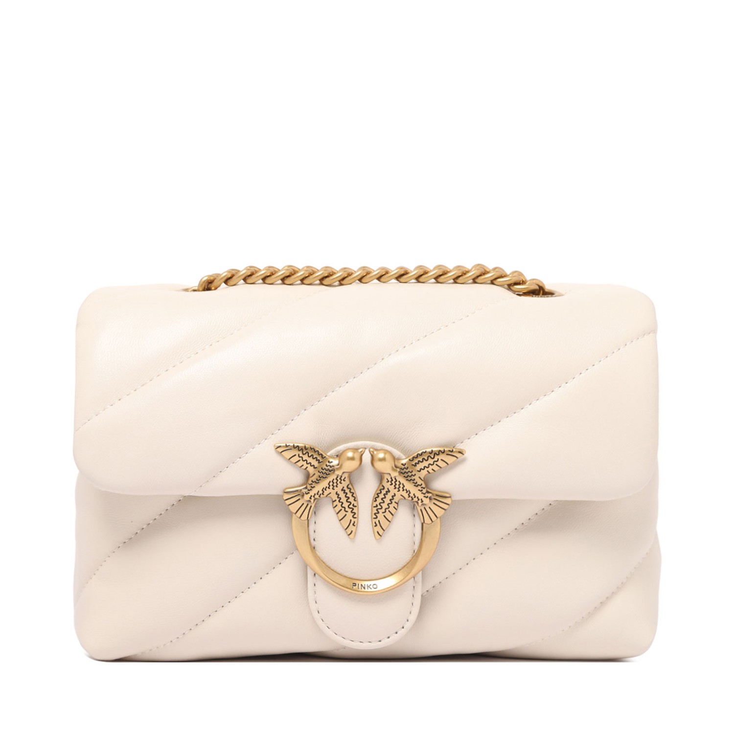Pinko White Mini Love Puff Bag. White leather crossbody bag, top flap with Love Birds Diamond Cut metal buckle. Adjustable round metal chain shoulder strap with nappa shoulder pad. Love Birds logo quilted on the back. Two main interior compartments, zipped partition pocket, wall pocket. Metal parts with antique gold finish.