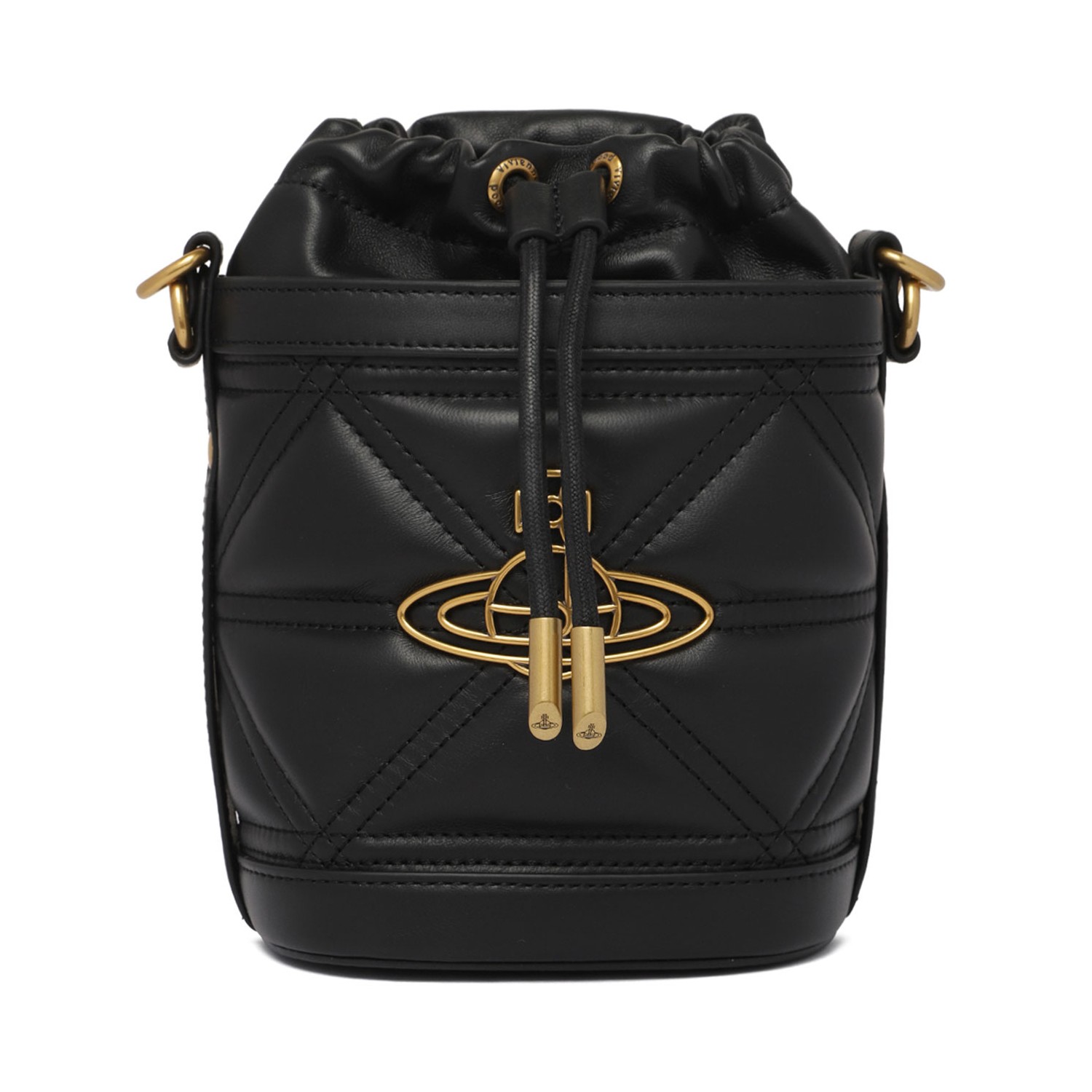 Vivienne Westwood Black Small Kitty Bucket Bag. Black leather bucket bag, top drawstring fastening, single detachable top handle. Main compartment, quilted.