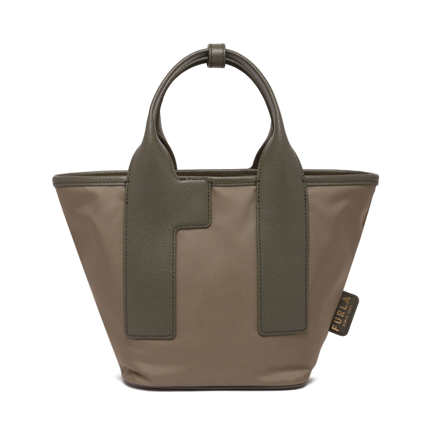 Furla Dark Beige Piuma S Tote Bag. Dark beige recycled nylon tote bag, grained leather trim, adjustable detachable shoulder strap. Logo jacquard shoulder strap, two top handles, logo tag to the side. Main compartment, internal patch pocket, internal logo tag. Gold tone hardware, branded zip puller, top zip fastening.