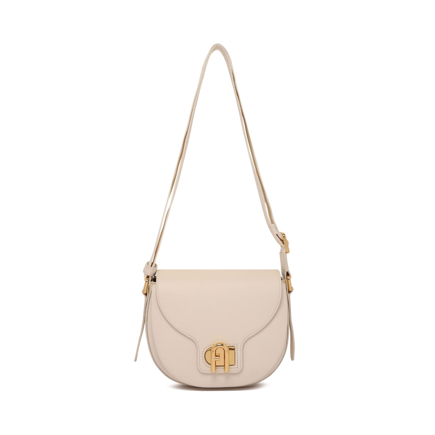 Furla Light Beige Shoulder Bag. Light beige calf leather shoulder bag with twist-lock fastening, adjustable logo-jacquard shoulder strap, slip pocket to the front.