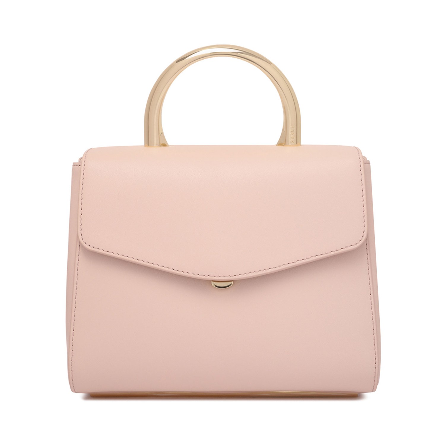 Furla Light Pink Meridiana Mini Bag. Light pink calf leather mini bag with foldover top with magnetic fasteningm detachable shoulder strap and single circular top handle.