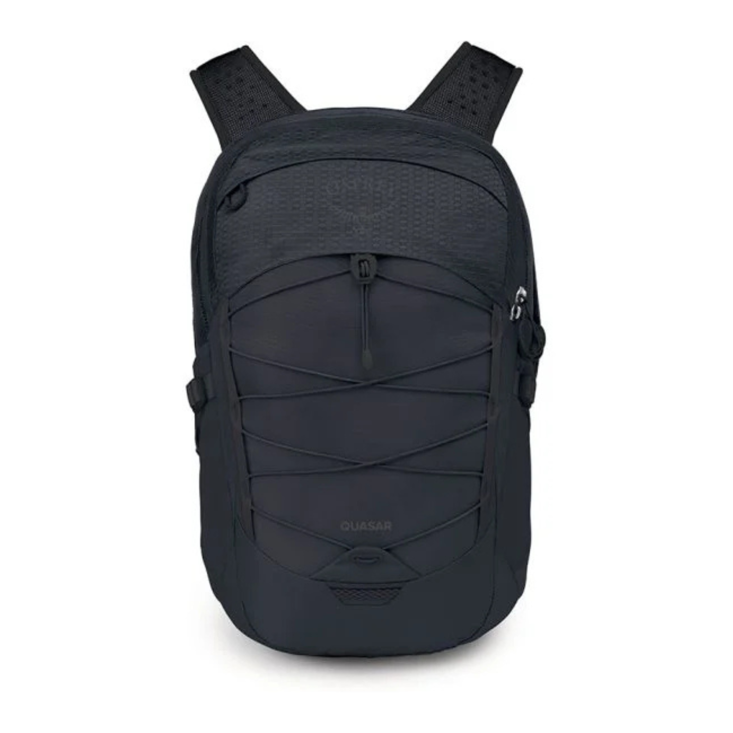 Osprey Black Quasar 26 Backpack. Black backpack with internal pocket for laptop/documents, anti-scratch pocket with zipper. Two elastic mesh water bottle pockets, internal storage pocket. Adjustable bungee cords on front panel with quick release buckle.