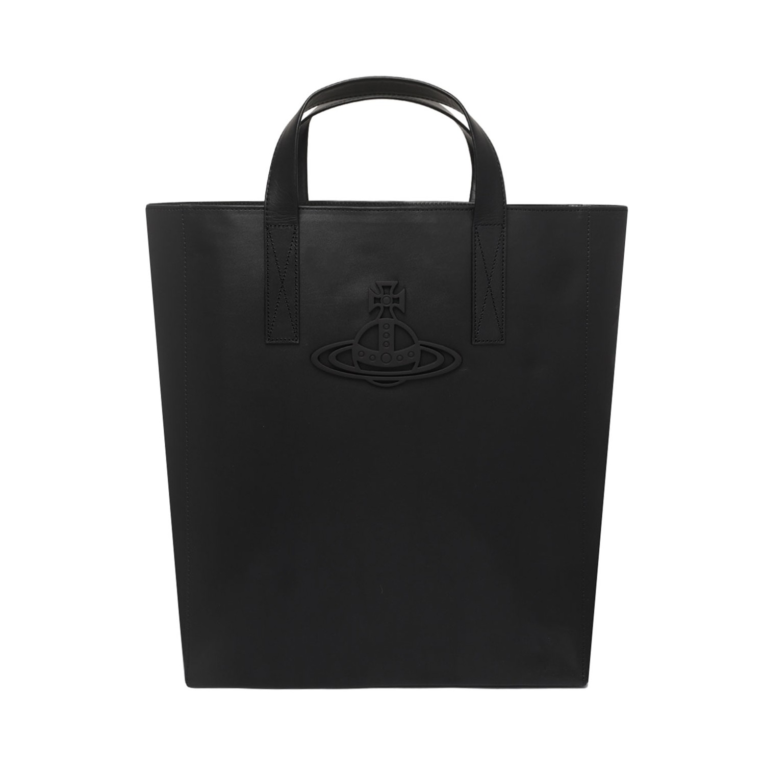 Vivienne Westwood Black Sarah Medium Tote Bag. Black calf leather tote bag with two top handles, logo print to the front, main compartment.