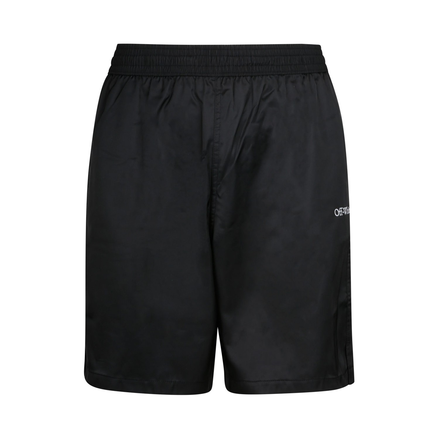 Off White Black Arr Surfer Swim Shorts. Black swim shorts with logo print at the leg, signature Arrows motif to the rear, elasticated waistband with internal drawstring. Straight leg, two side slit pockets, rear patch pocket, short side slits, straight hem, knee length and mesh lining.