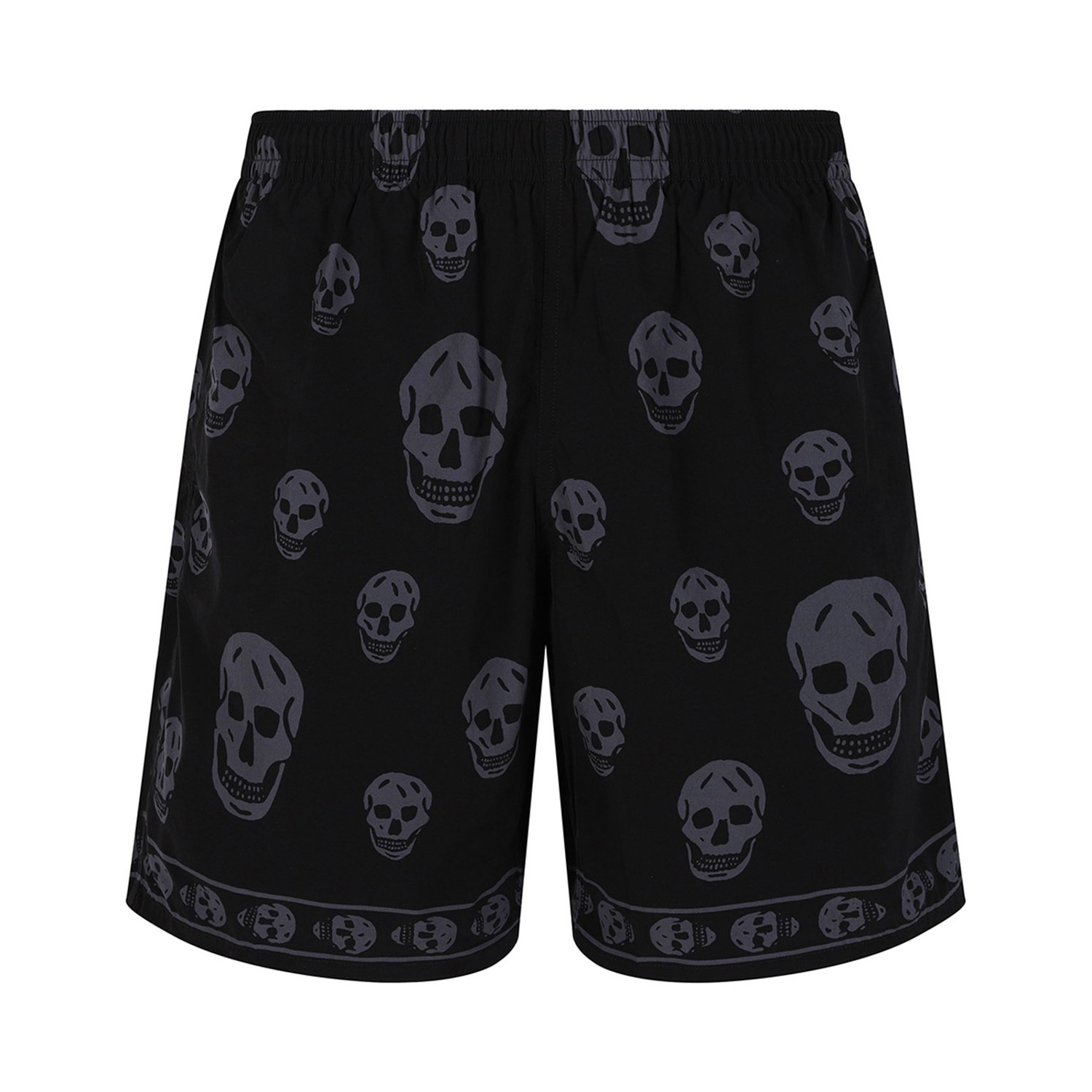 Alexander McQueen Black Swim Shorts With Skull Motif. Black swim shorts with skull motif, elasticated waistband and drawstring, side welt pockets.
