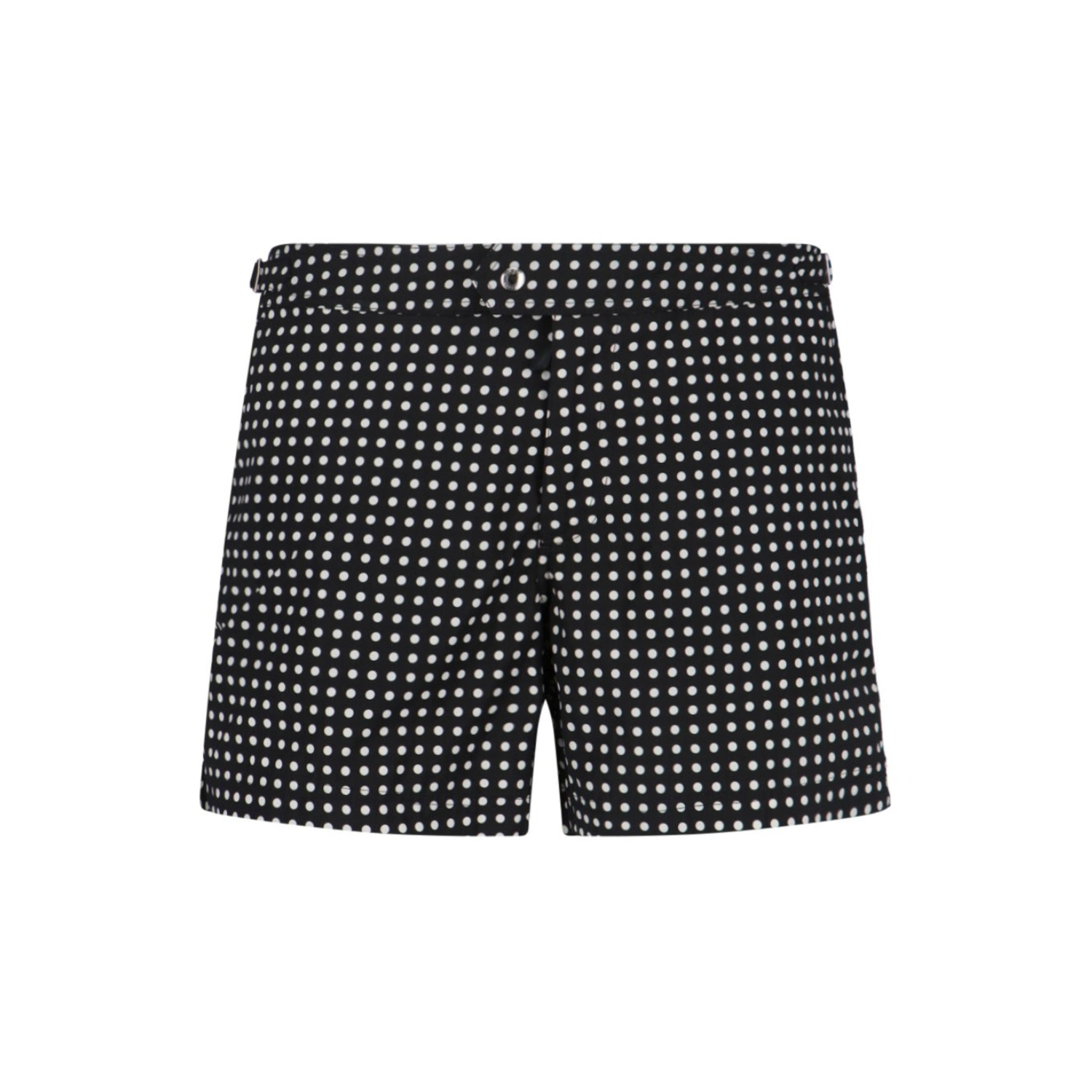 Tom Ford Polka Dot Swim Shorts. Swim shorts crafted in lightweight black fabric with a contrasting white polka dot pattern. Designed with a mid-rise waist and front zip and button closure, they feature adjustable side tabs for a refined, tailored fit. Completed with side pockets and a rear zip pocket for practicality. A sophisticated beachwear piece that reflects Tom Ford