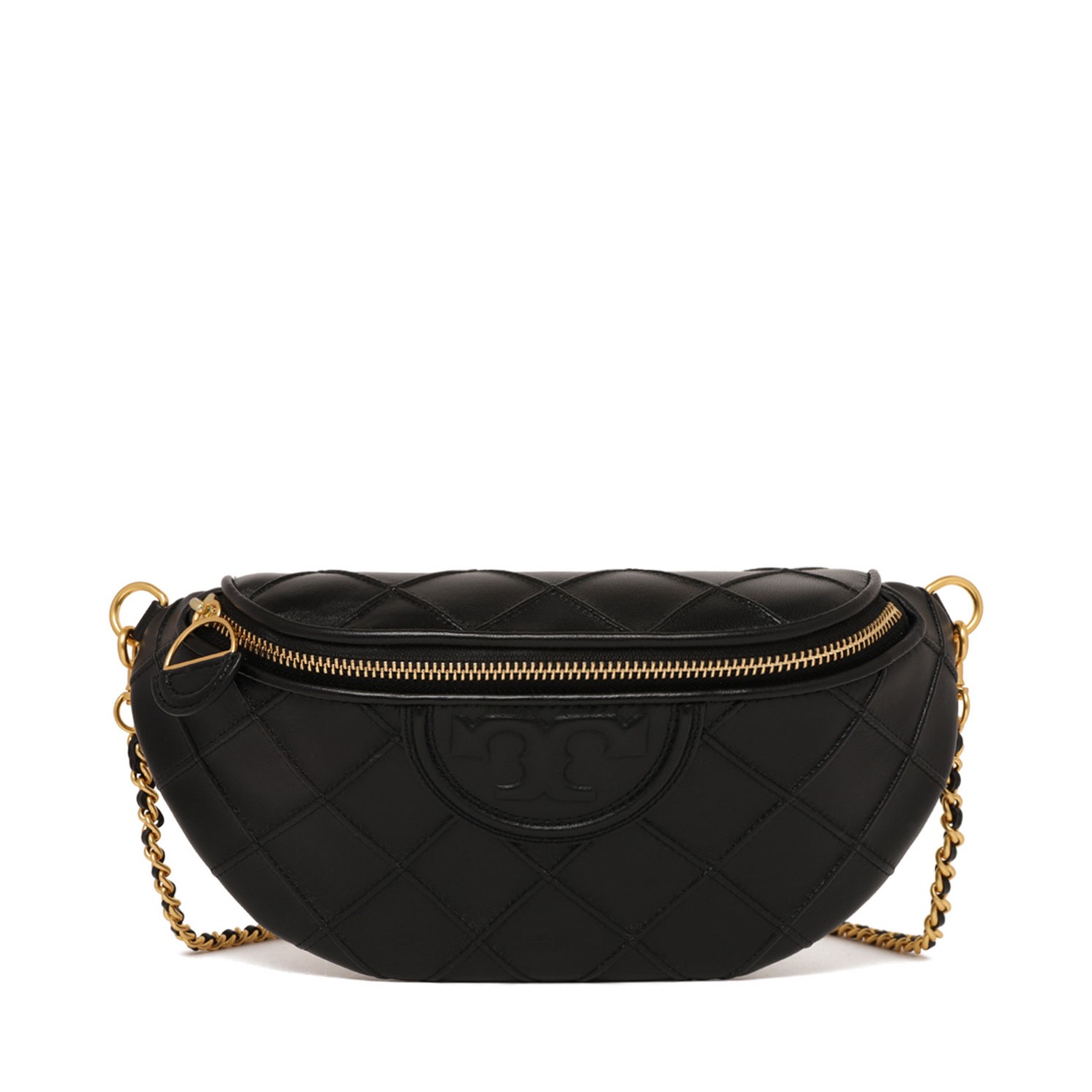 Tory Burch Fleming Black Leather Bum Bag. Black leather bum bag with folds adjustable and removable shoulder strap, removable chain, shoulder strap with 't' logo in tone, zip one, back zip pocket.