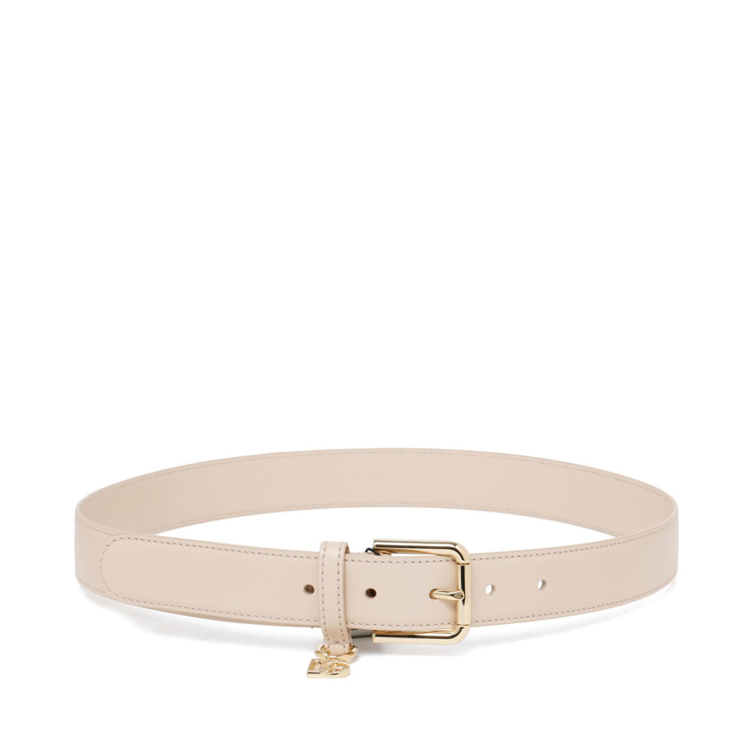 Dolce & Gabbana Light Pink DG Logo Belt. Light pink calfskin belt with DG logo, rolled buckle and belt loop stop.