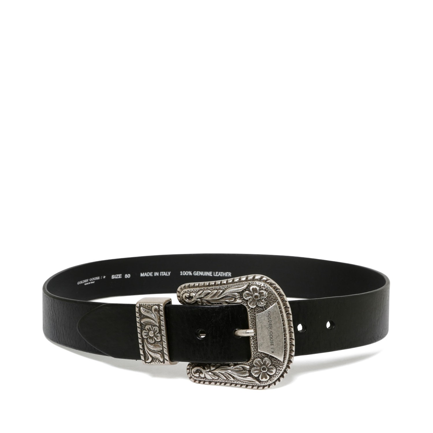 Golden Goose Black Engraved Logo Belt. Black calf leather belt, punch hole detailing, adjustable fit, buckle fastening.