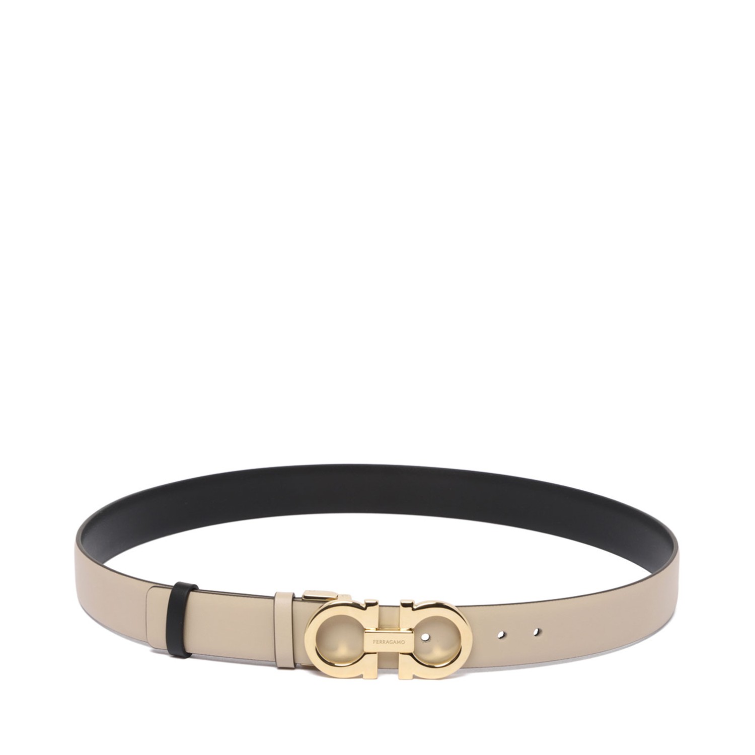 Ferragamo Beige Gancini Reversible Belt. Beige calf leather belt, smooth grain, reversible, pin-buckle fastening. Gancini buckle, engraved logo, punched holes, belt loops, adjustable fit.