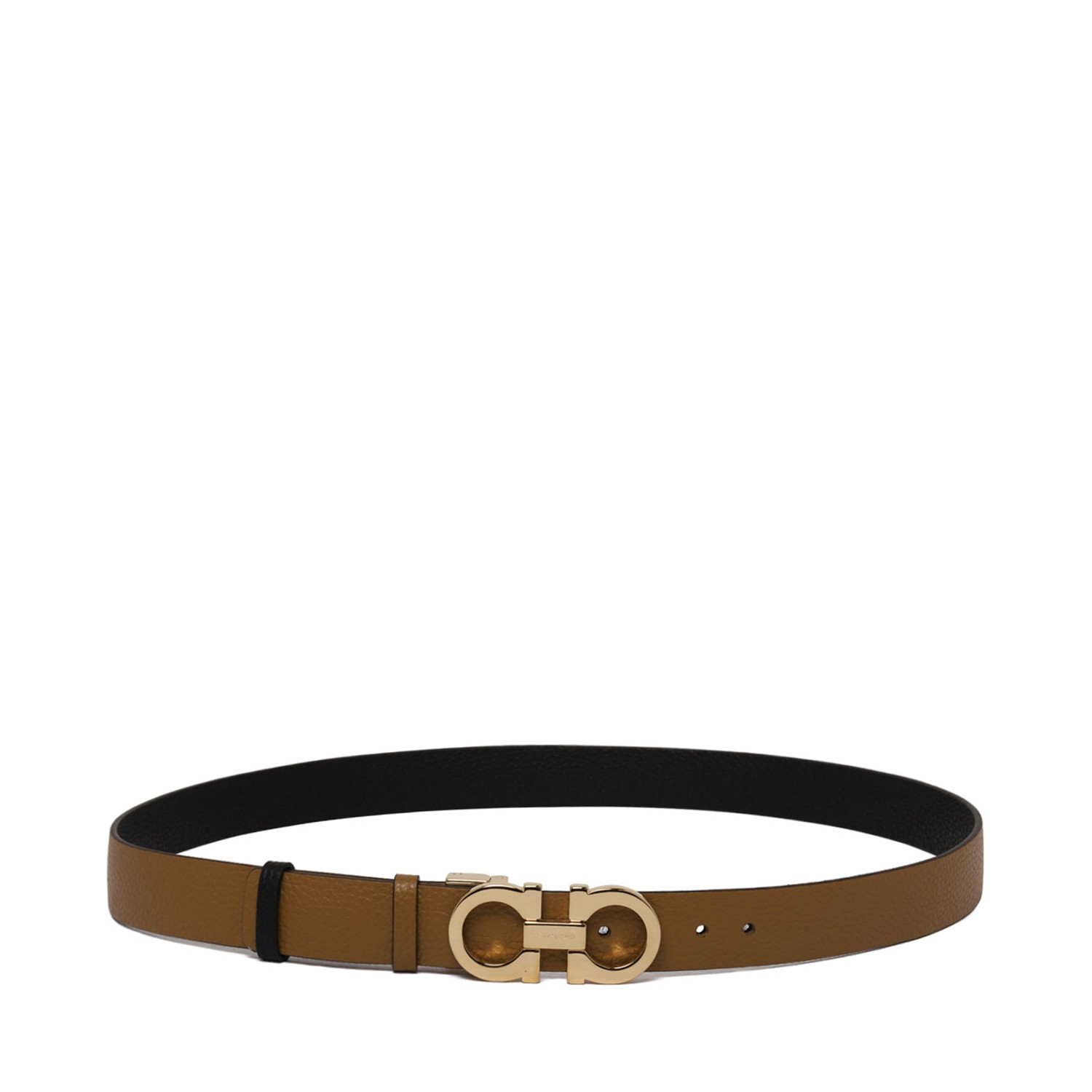 Ferragamo Brown Gancini Belt. Brown calf leather belt with a gold-finish Gancini buckle. This style is adjustable in length for a personalized fit and style.