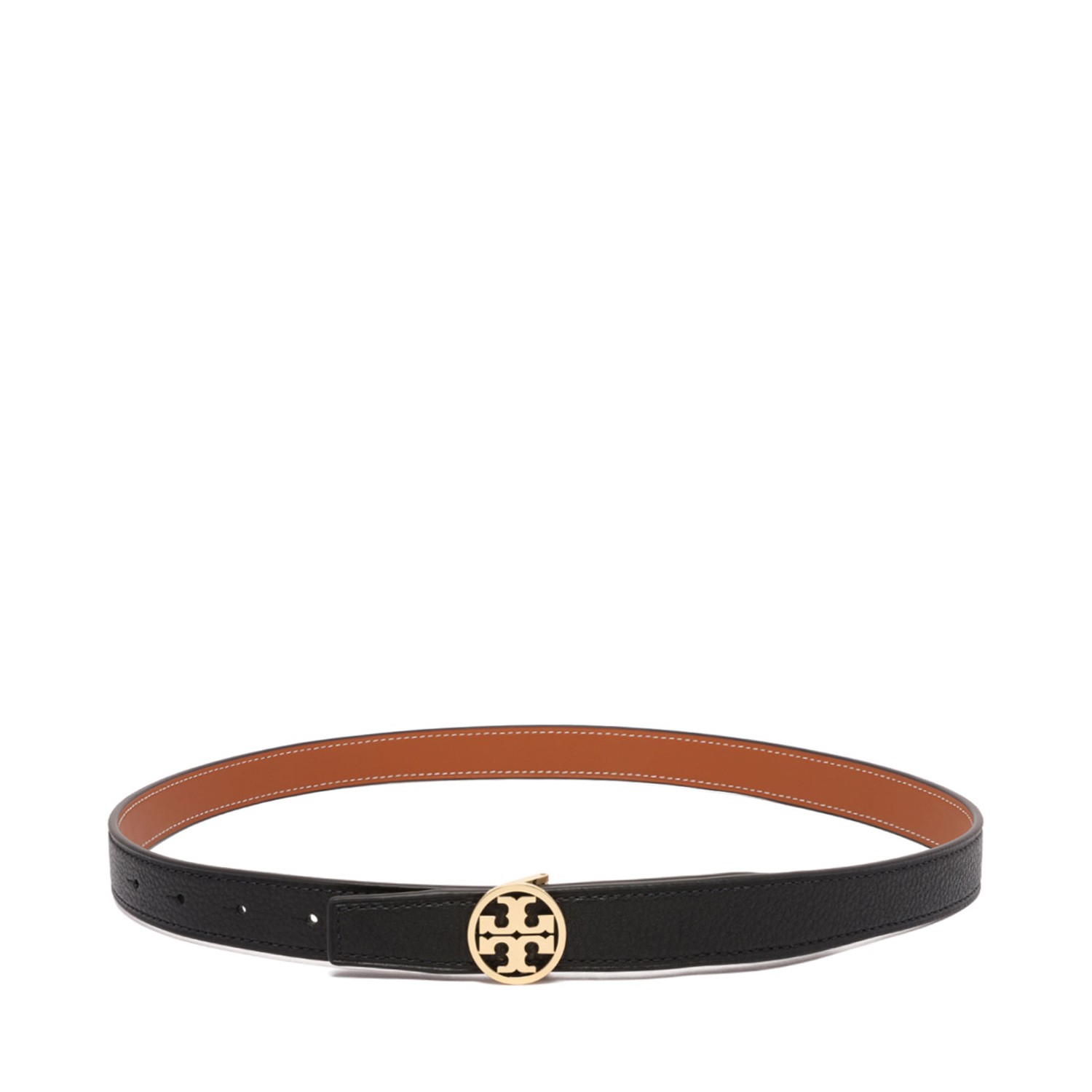 Tory Burch Black Reversible Miller Belt. Black hammered leather belt with logo buckle closure and gold metal accessories.